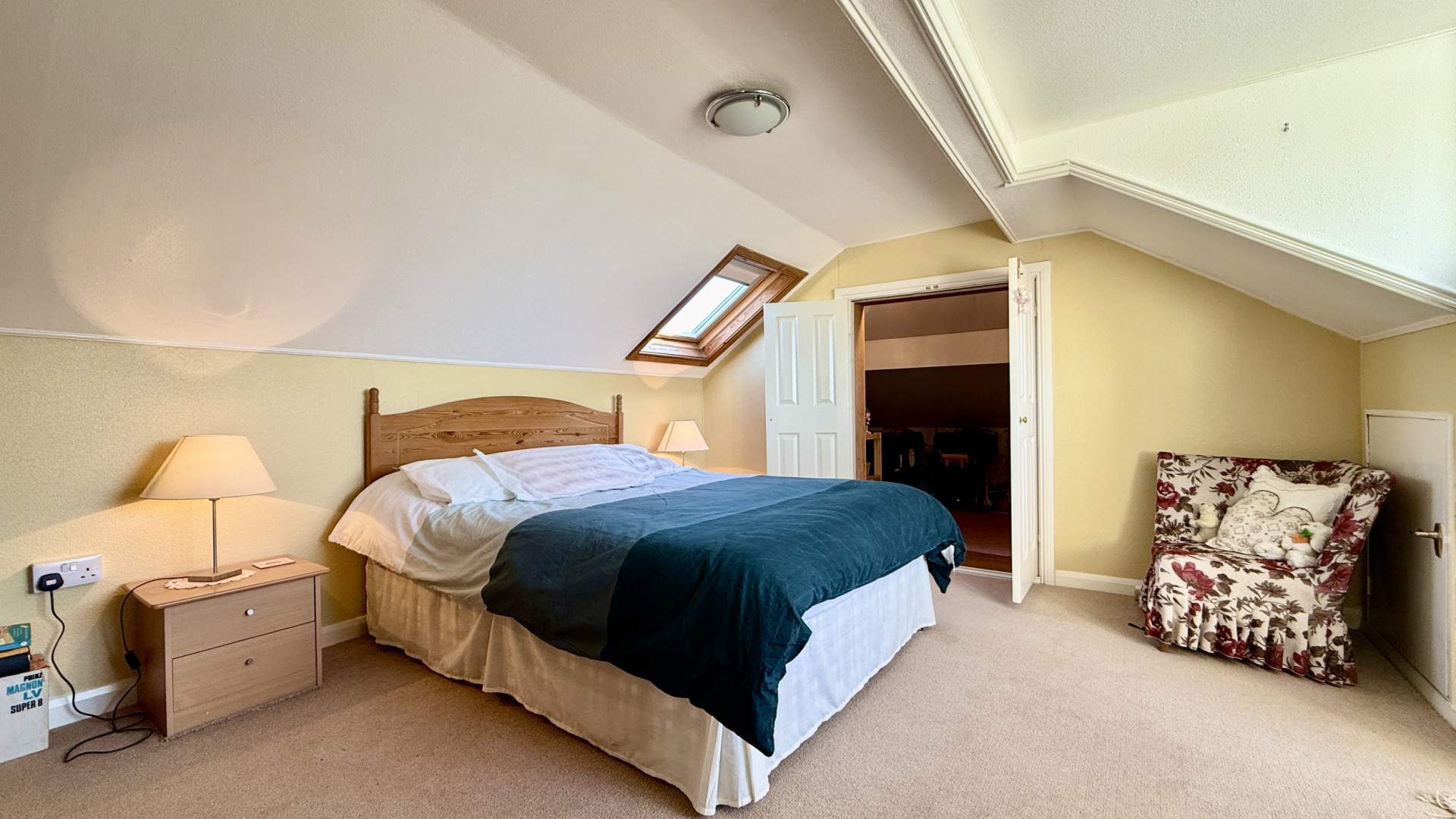 Large double bedroom located on your right when on the landing. There is a velux window the front aspect and a uPVC double glazed window looking on to the rear aspect and coastal views out to sea. Within the bedroom there is a storage cupboard behind the door and a large storage space behind the double doors at the far end of the bedroom. In the bedrooms there is a wash basin with wall mounted mirror above. The bedroom and storage cupboard have ceiling lights and are finished with carpeted flooring.