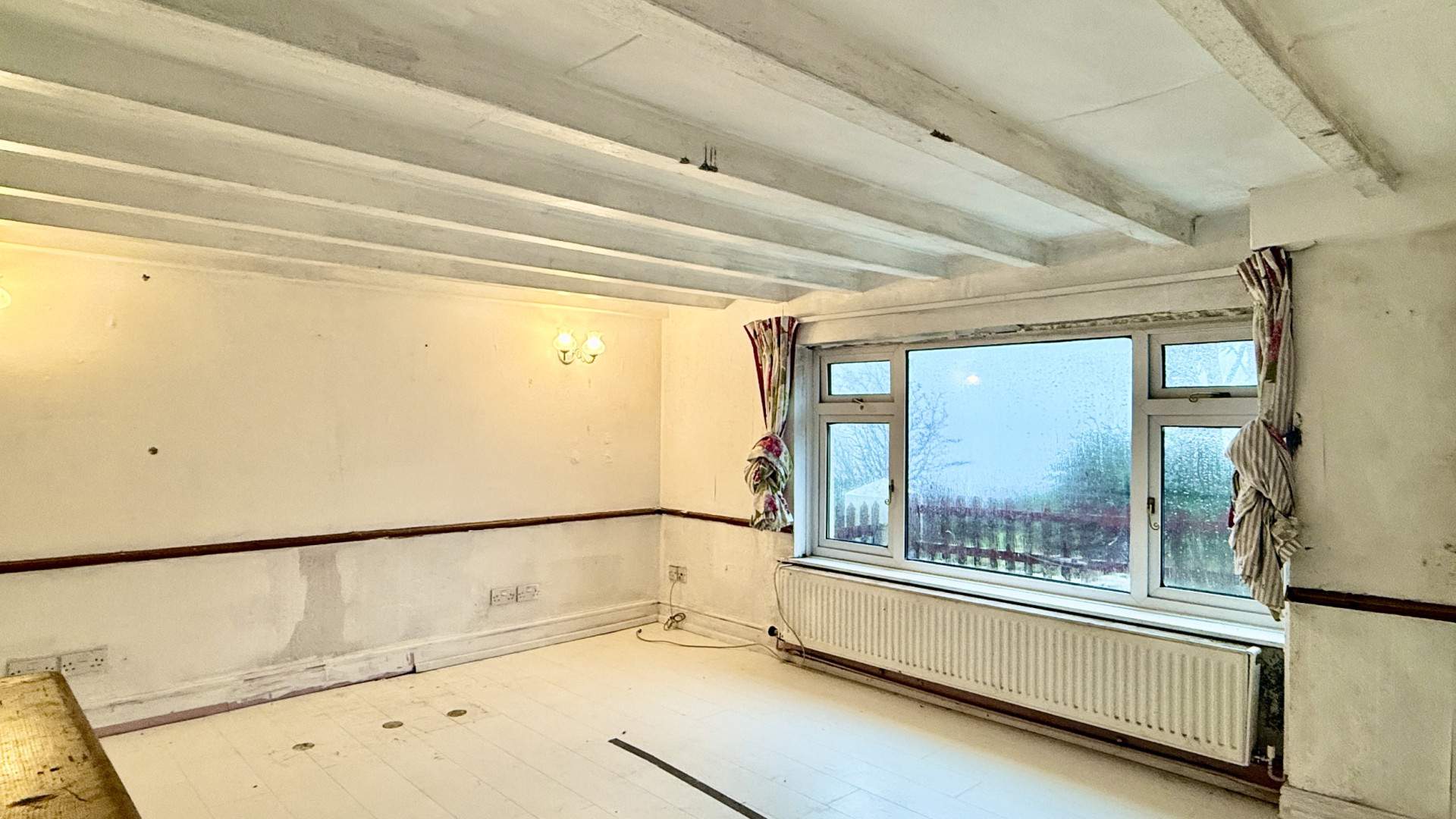 A spacious lounge with a large double glazed window providing views on to the front aspect. On the far wall are two wall lights and the lounge is finished with wooden flooring.