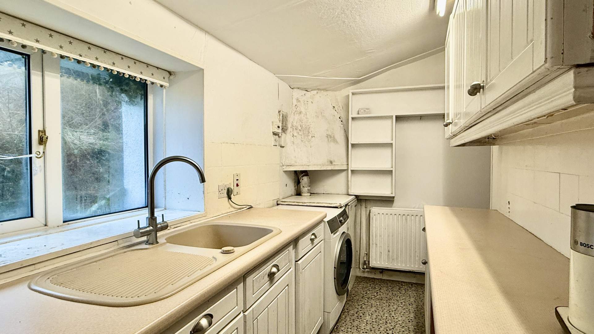 A galley style kitchen with a range of base and drawer units with mounted wall cupboards to two walls. Immediately ahead of you when entering the kitchen is the boiler with space adjacent to it for a standalone washing machine. Along the same wall is the sink with drainer positioned under the uPVC double glazed window providing views on to the side aspect. At the far end of the kitchen a stable effect door with a paned window providing access to the rear porch. The kitchen is finished with a ceiling light and linoleum flooring.