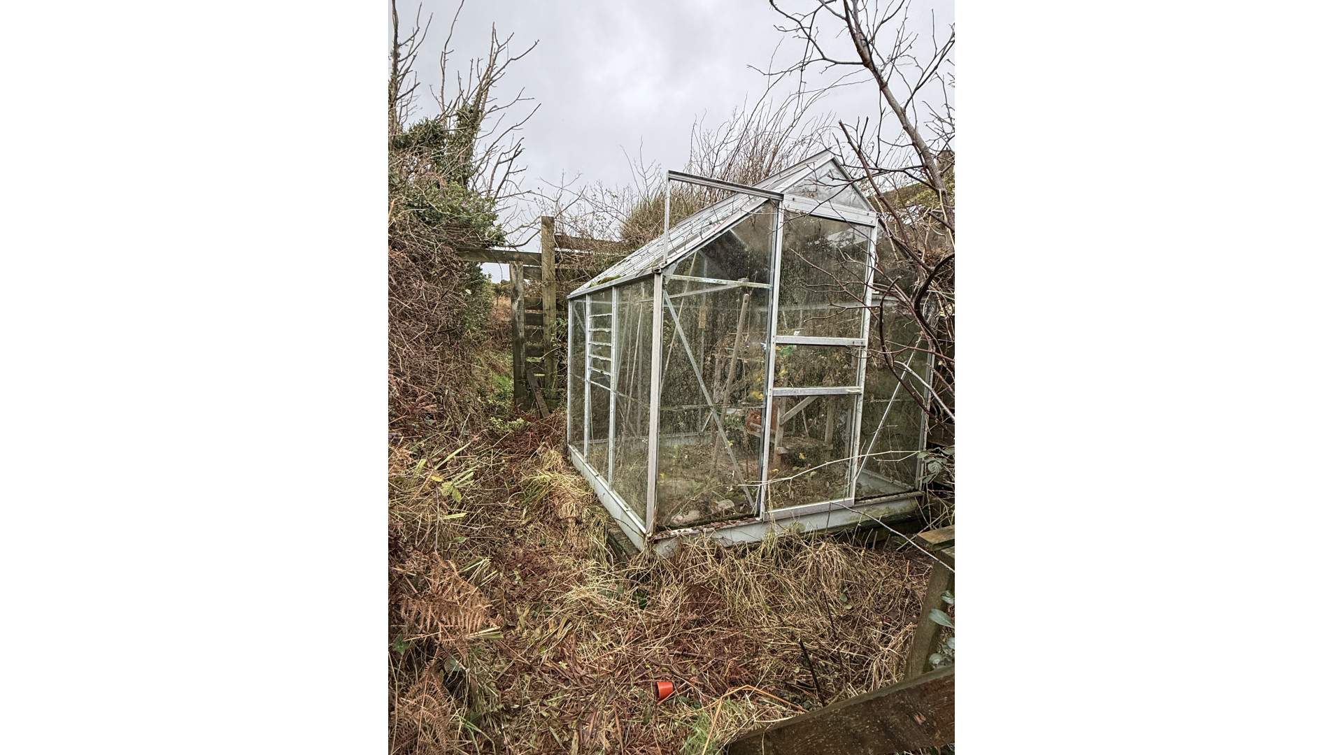 To the left of the property the garden is in the shape of a V with a greenhouse with a private seating area beyond positioned between the fence to the field behind and the hedgerow to the road.