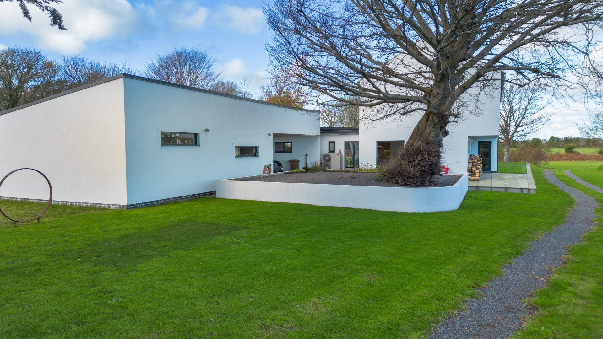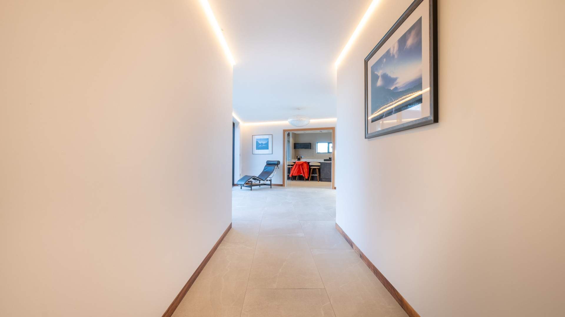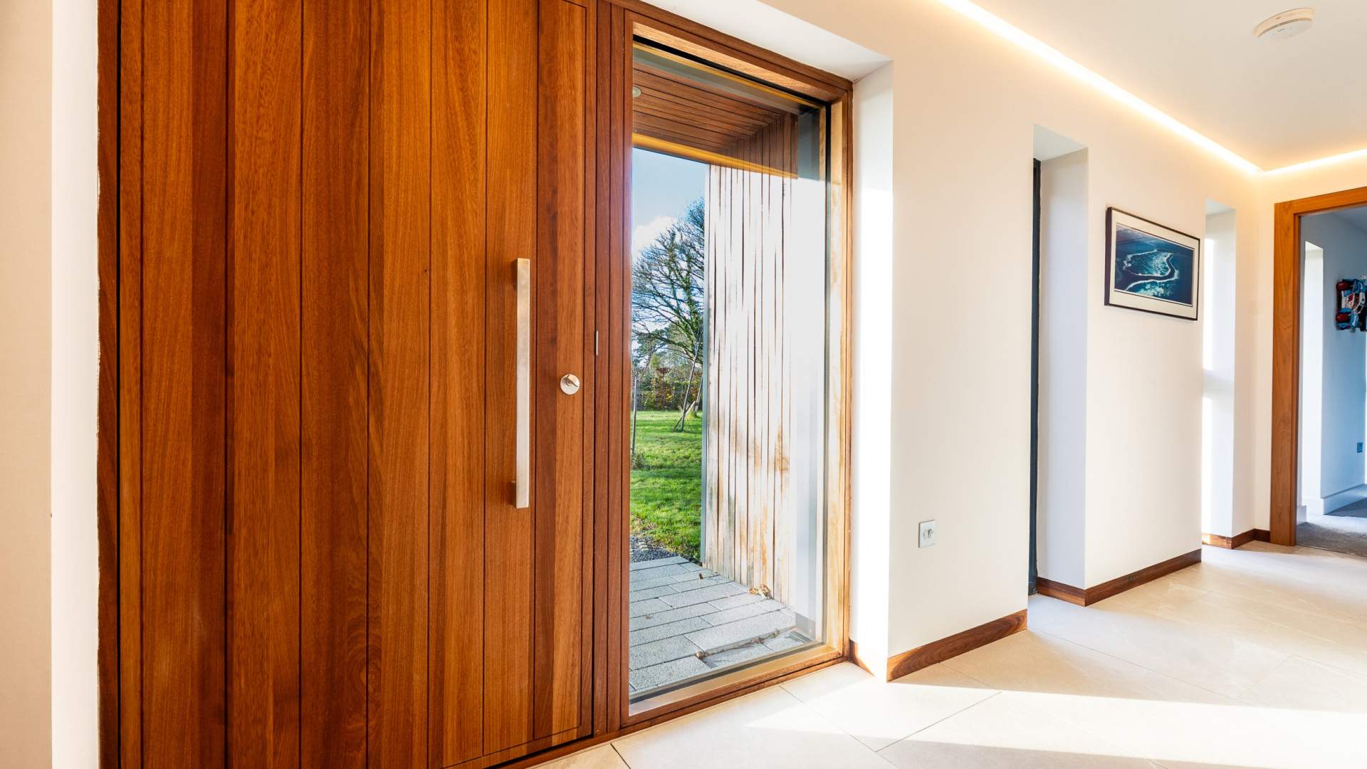 Entering through a large timber door into the bright and spacious hallway. To your left when entering the property is the family room at the end of the hallway, a double bedroom with en-suite bathroom and a storage cupboard. To your right is the utility with a bathroom and the plant room for the property. Beyond the utility on your right hand side is a WC, the office and doors to the lounge/dining/kitchen are at the end of the entrance hall. A set of sliding doors prior to the kitchen provides access to the court yard.