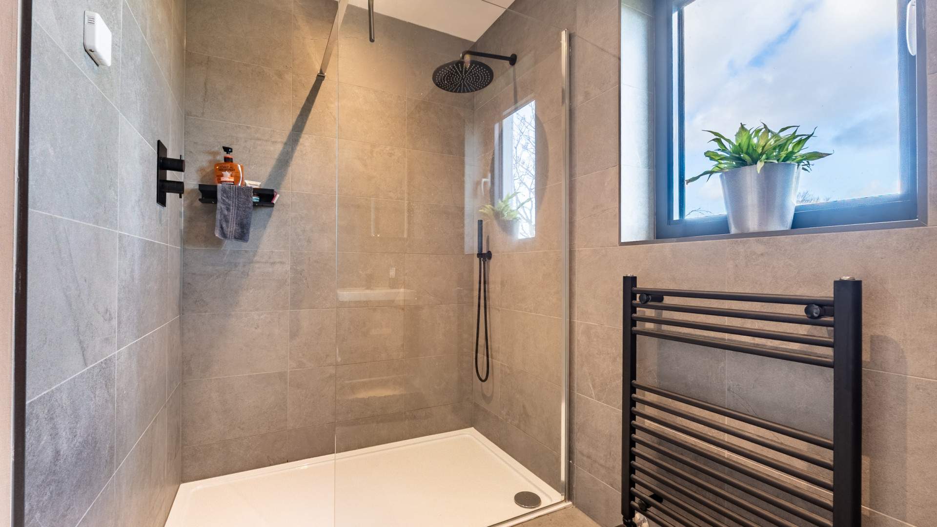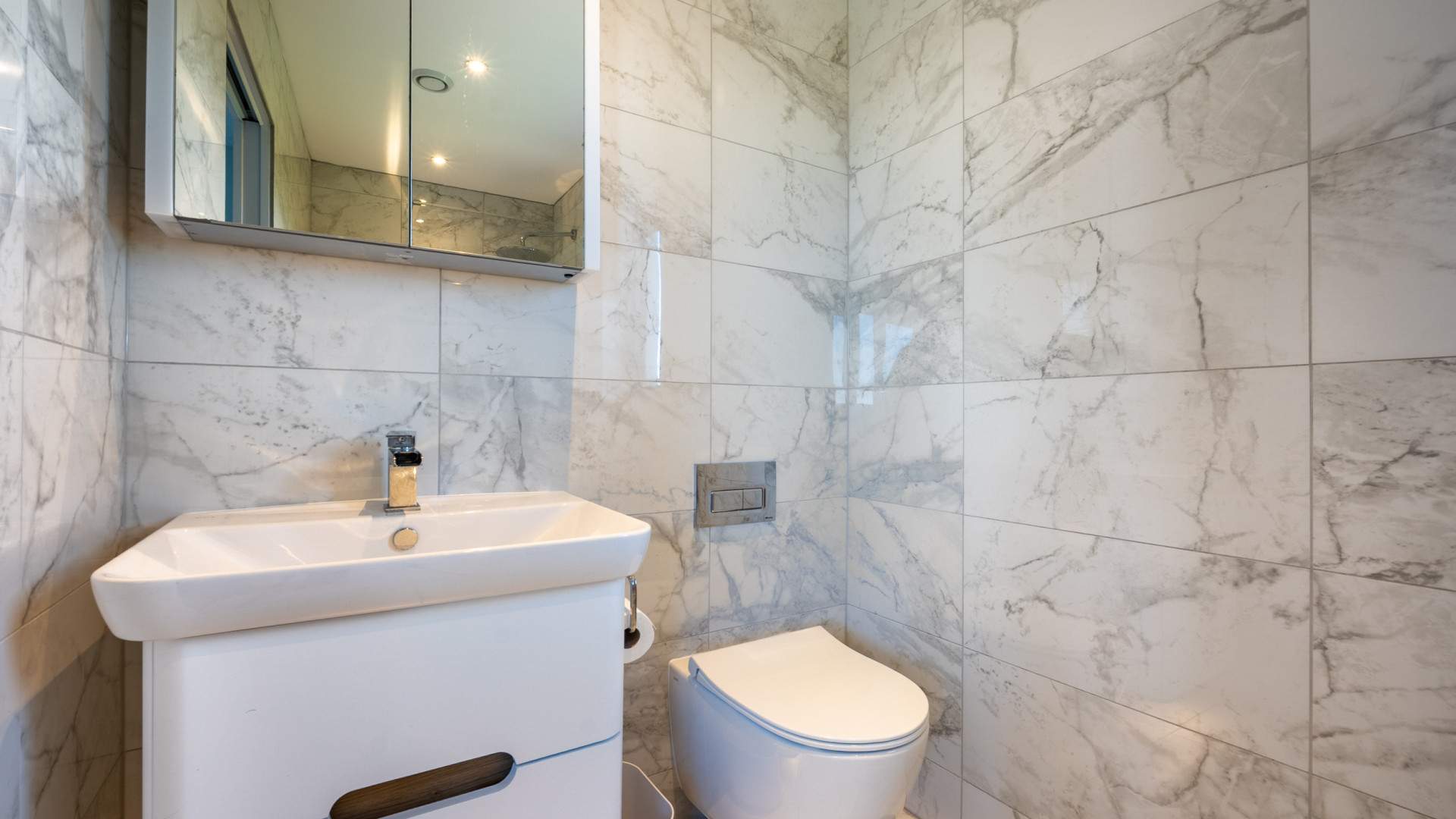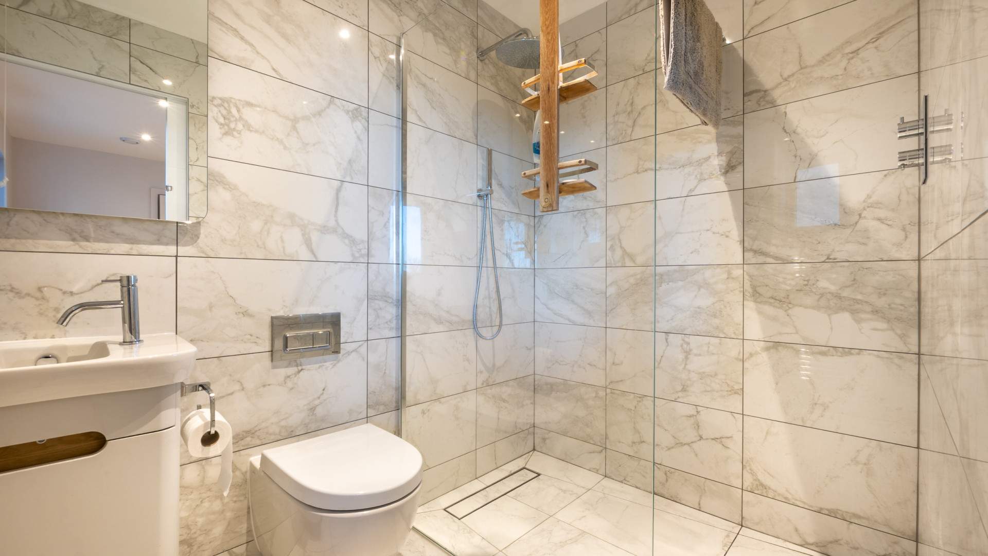 Accessed via a sliding door the bathroom has a walk in shower to your right, the wall hung WC with a hidden cistern to your left along with the vanity unit with sink on top. Wall mounted above the sink is a storage cupboard with mirrored doors. A towel rail is underneath the window looking on the side aspect. The bathroom is finished with recessed ceiling lights, tiled flooring and walls.