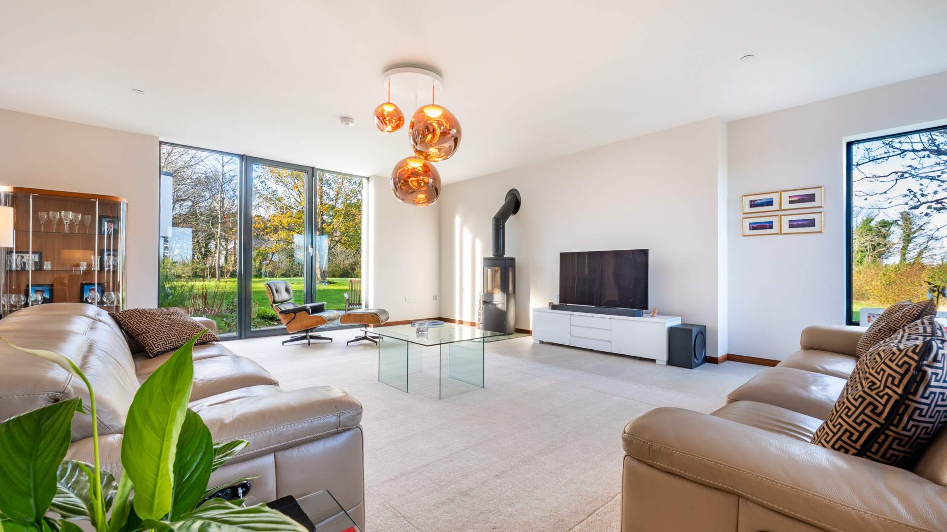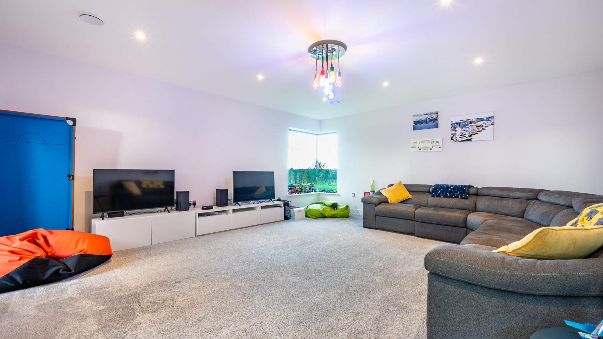 Turning left when entering the property, located at the end of the entrance hall is a bright and spacious room with windows providing views to three aspects of the property. The family room is finished with ceiling lights and carpeted flooring.