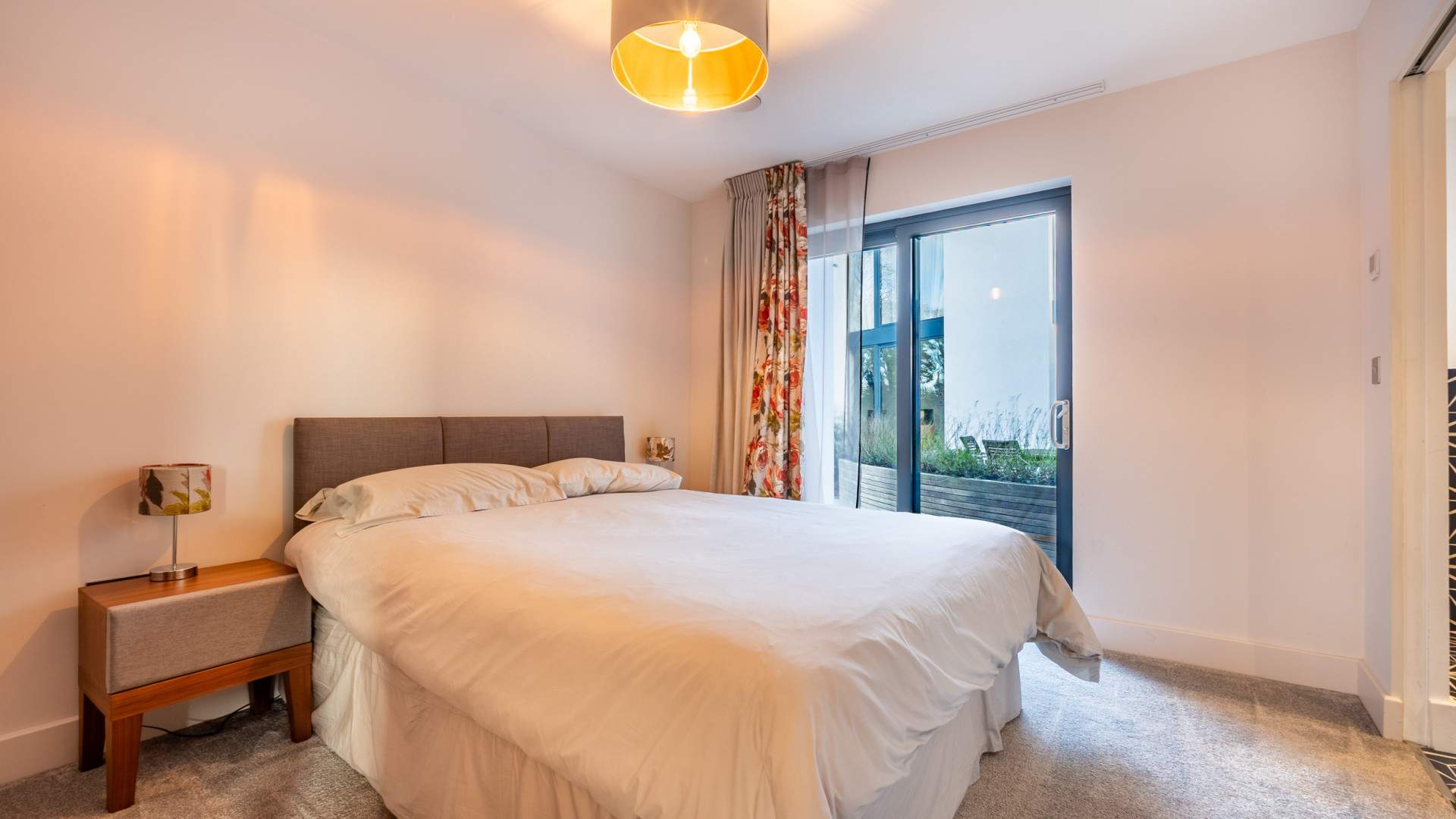 Double bedroom next to the family room with a sliding door which access the court yard area opposite the lounge/kitchen/diner. A sliding wooden door provides access to the en-suite bathroom. The bedroom is finished with a ceiling light and carpeted flooring throughout.