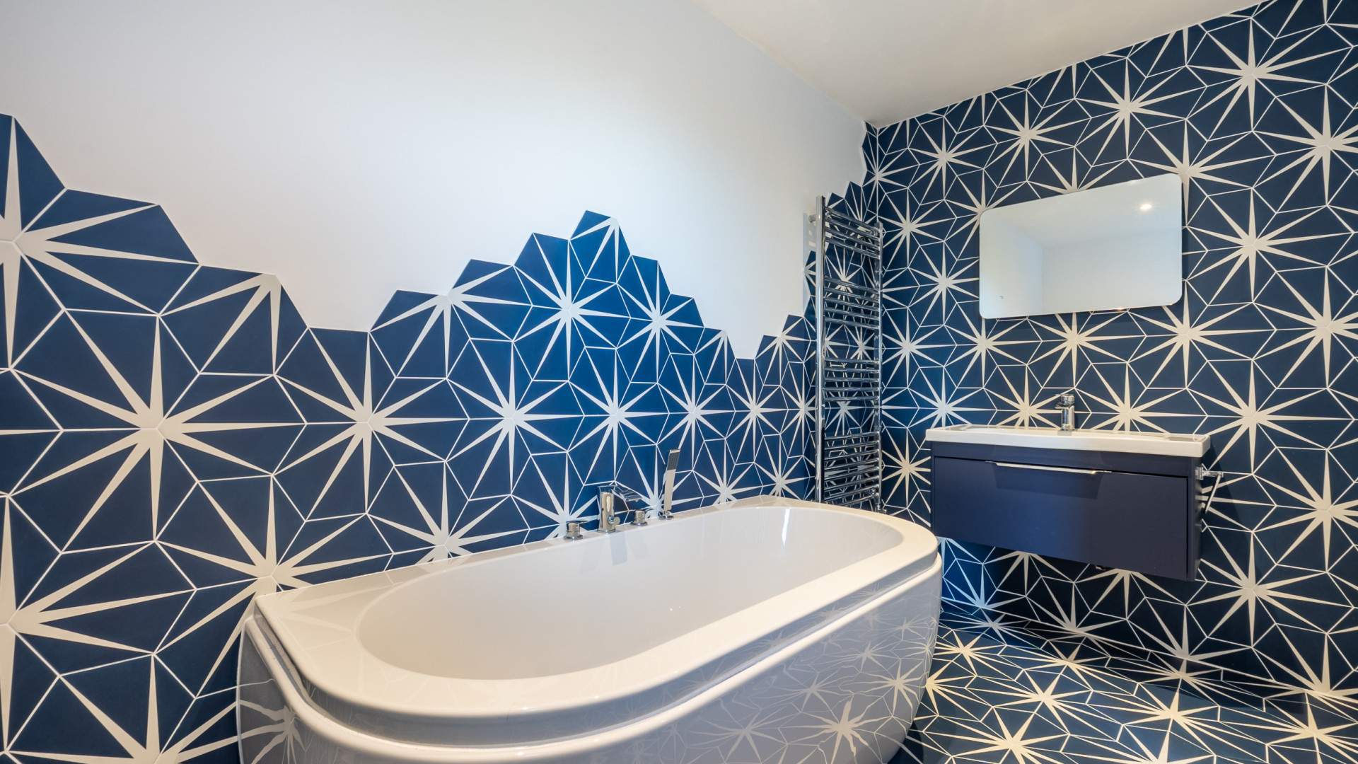 Rectangular shaped bathroom with a large bath immediately ahead of you with the wall mounted sink and drawer below to your right. Above the sink with mixer tap is a wall mounted mirror and a large chrome towel rail to the left. To the left when entering the bathroom is the WC and a window looking on to the courtyard. The bathroom is finished with recessed ceiling lights, partially tiled walls and a fully tiled floor.