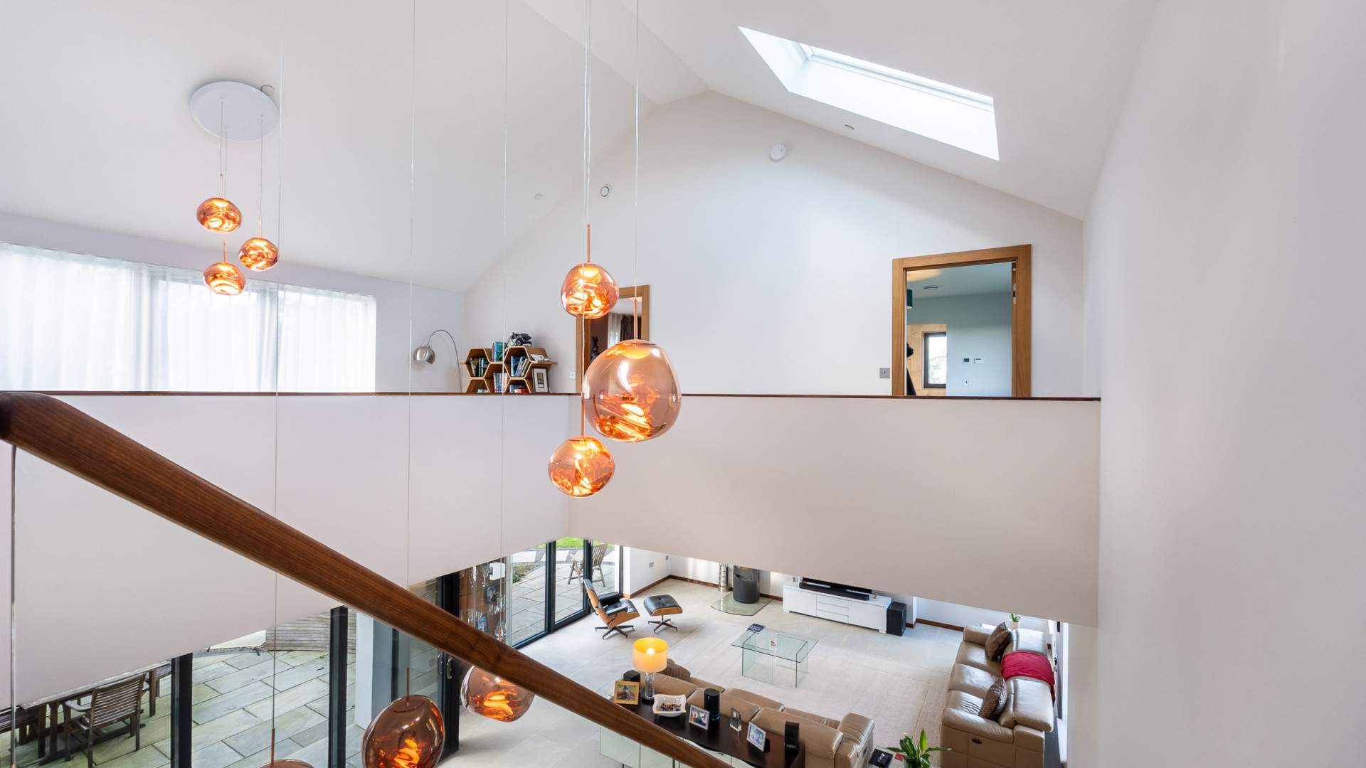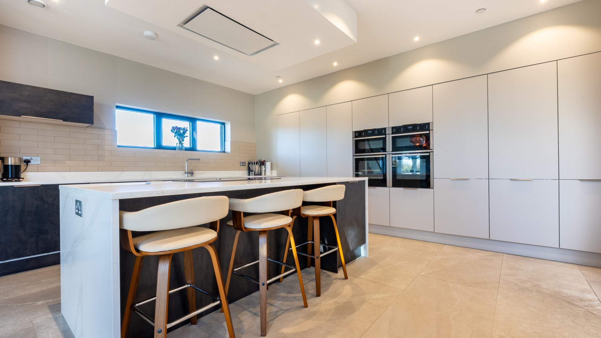 A vast space with the kitchen ahead of you after entering from the entrance hall. Along the wall on your right are tall cupboards across the width of the room providing storage which include two double ovens with a grill. In addition there is a full length fridge and separate freezer, further cupboards are along the wall under the window looking on to the rear aspect. There is the sink with drainer and a under the counter fridge with an island position opposite which has the induction hob and extractor fan above. On the opposite side of the island to the hob is space for three bar stools, a dining area is beyond the kitchen area with a set of three sliding doors accessing the court yard. At the far end of the room beyond the staircase accessing the first floor is space for relaxing and a multi fuel stove with further windows providing views to three aspects. The entire room is finished with ceiling lights and tiled flooring.