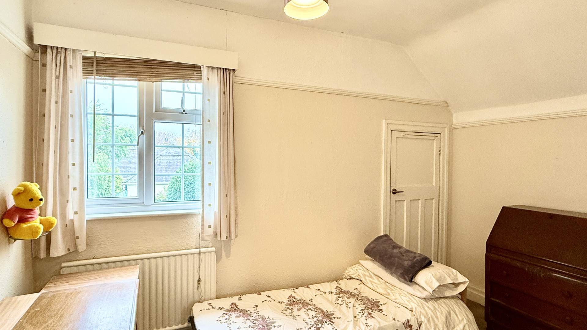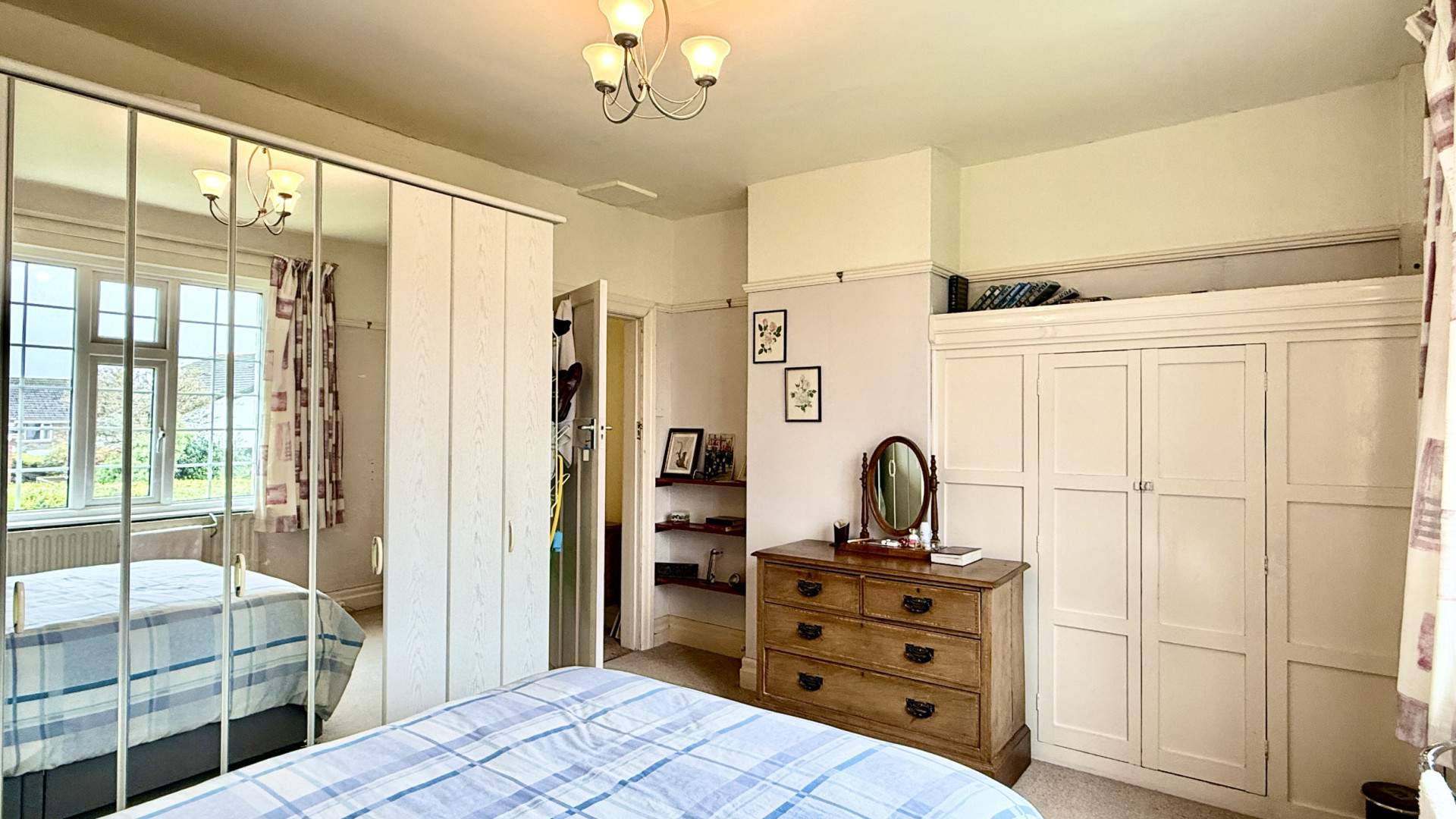 Double bedroom with a uPVC double glazed window with views on to the front aspect. Positioned behind the door is a built-in double wardrobe, a further door in the bedroom provides access to a storage cupboard which houses the hot water tank for the property. A further door within the storage cupboard provides access to further eaves storage, the bedroom is finished with a ceiling light and carpeted flooring.
