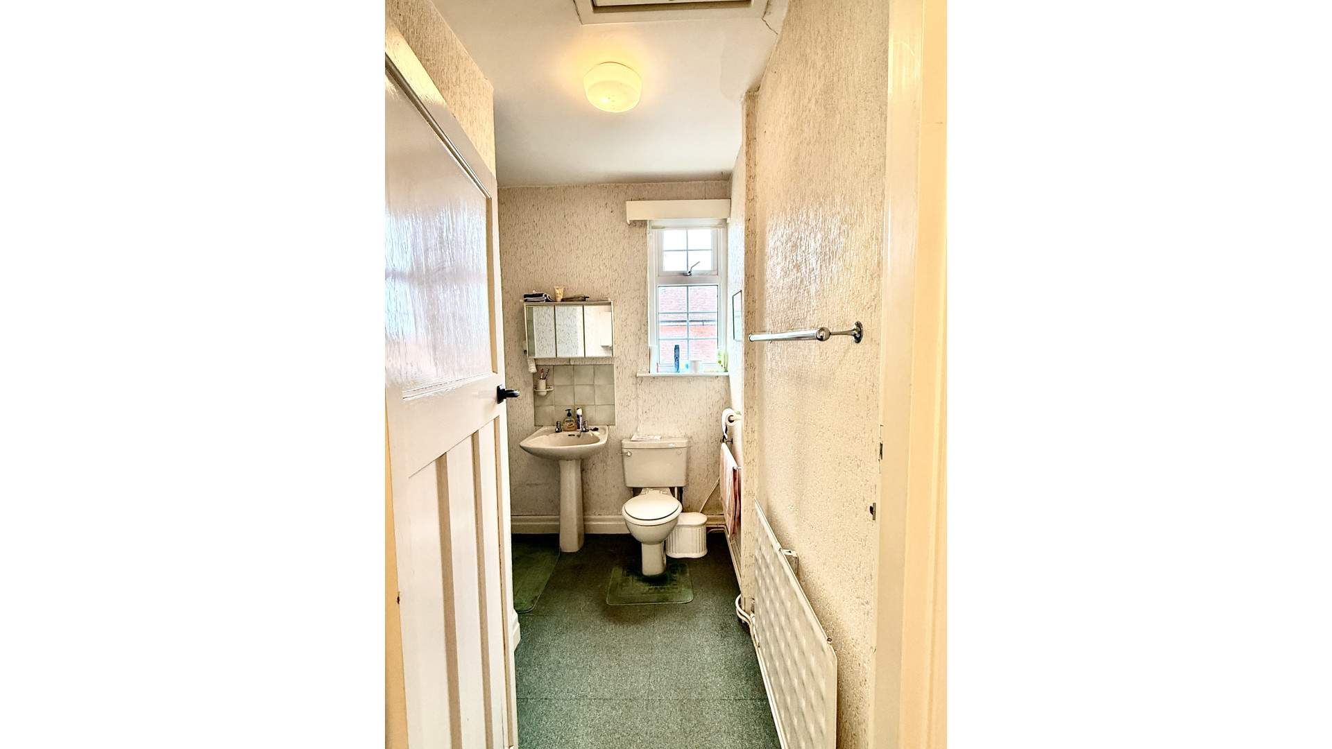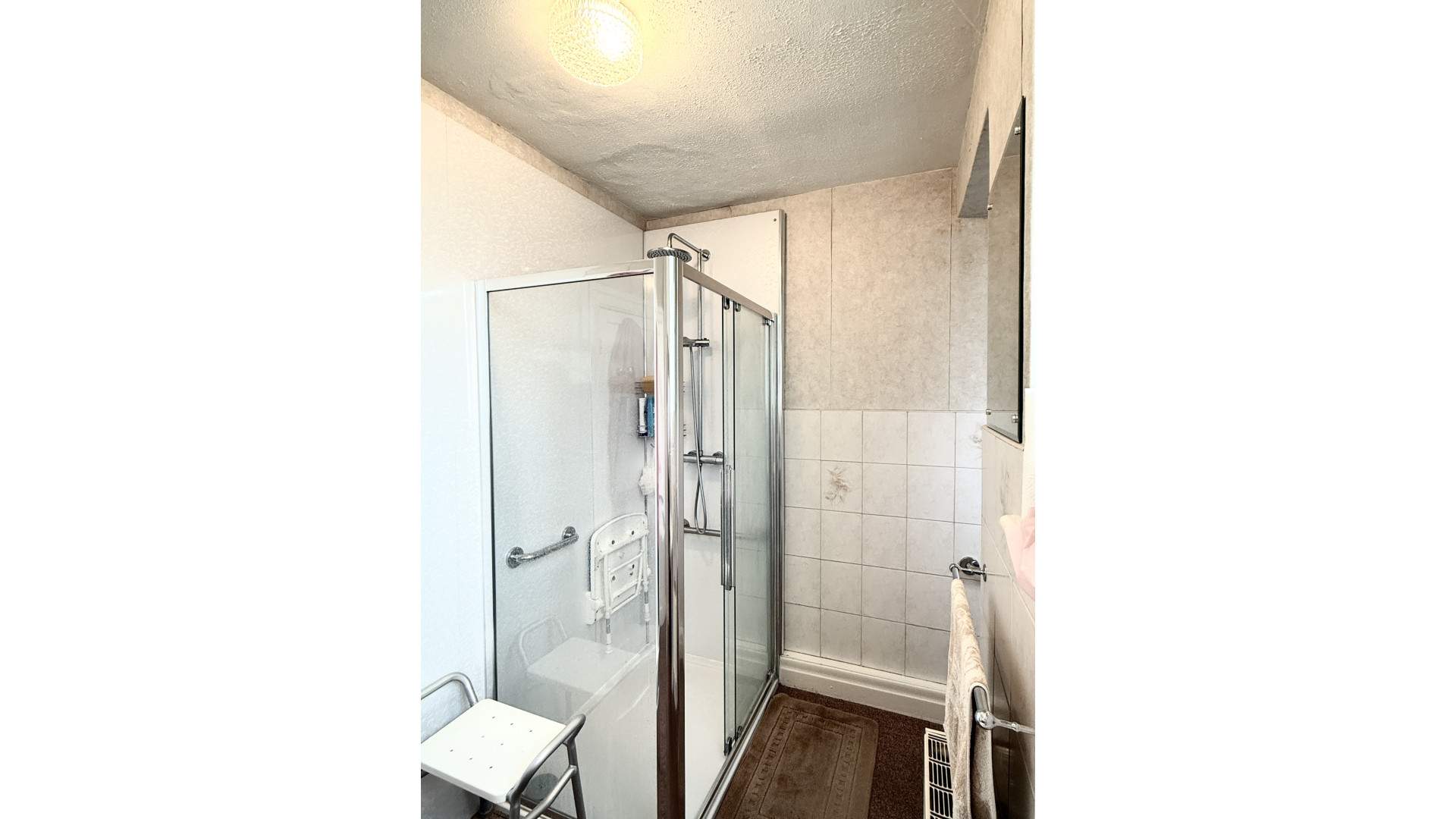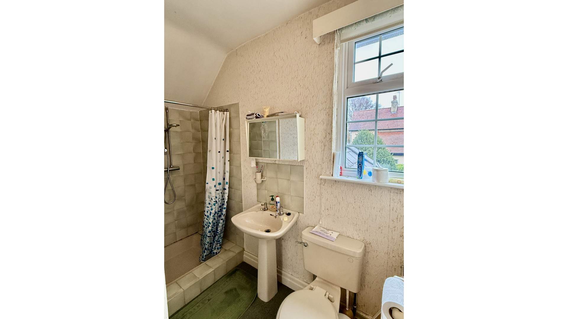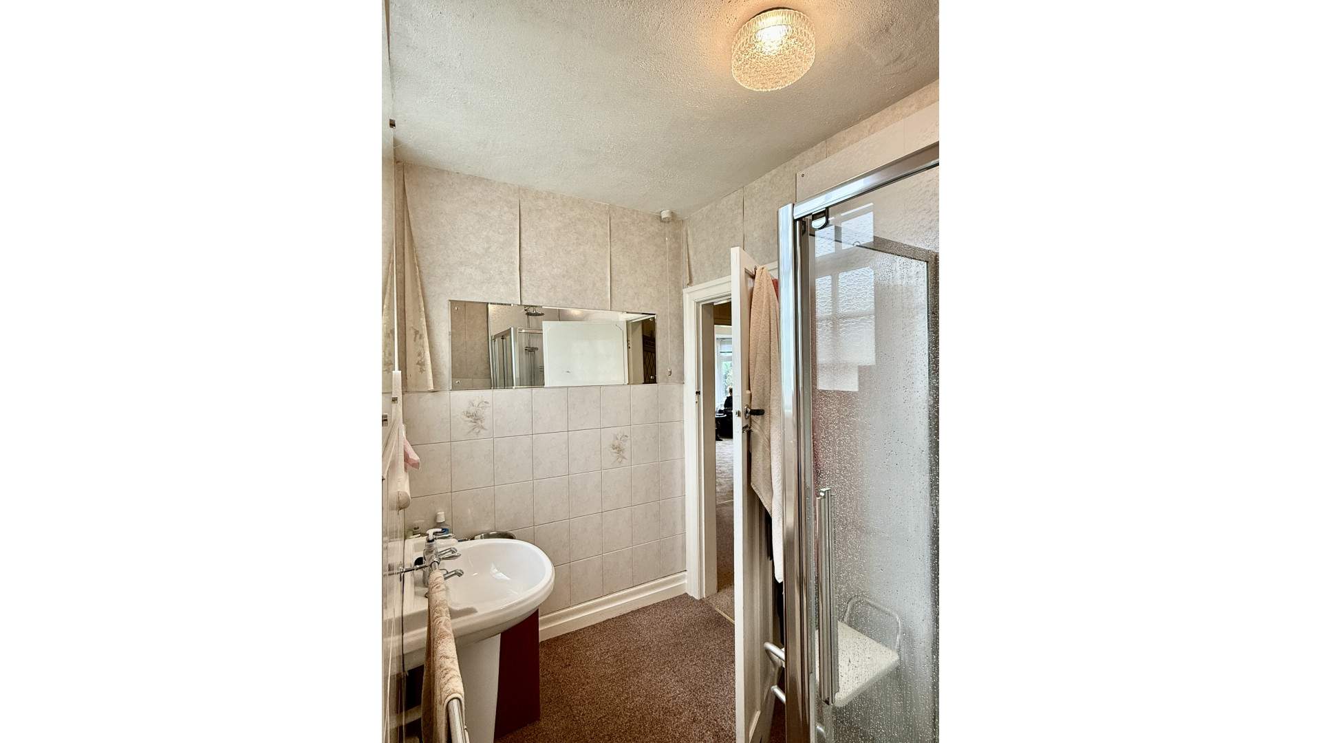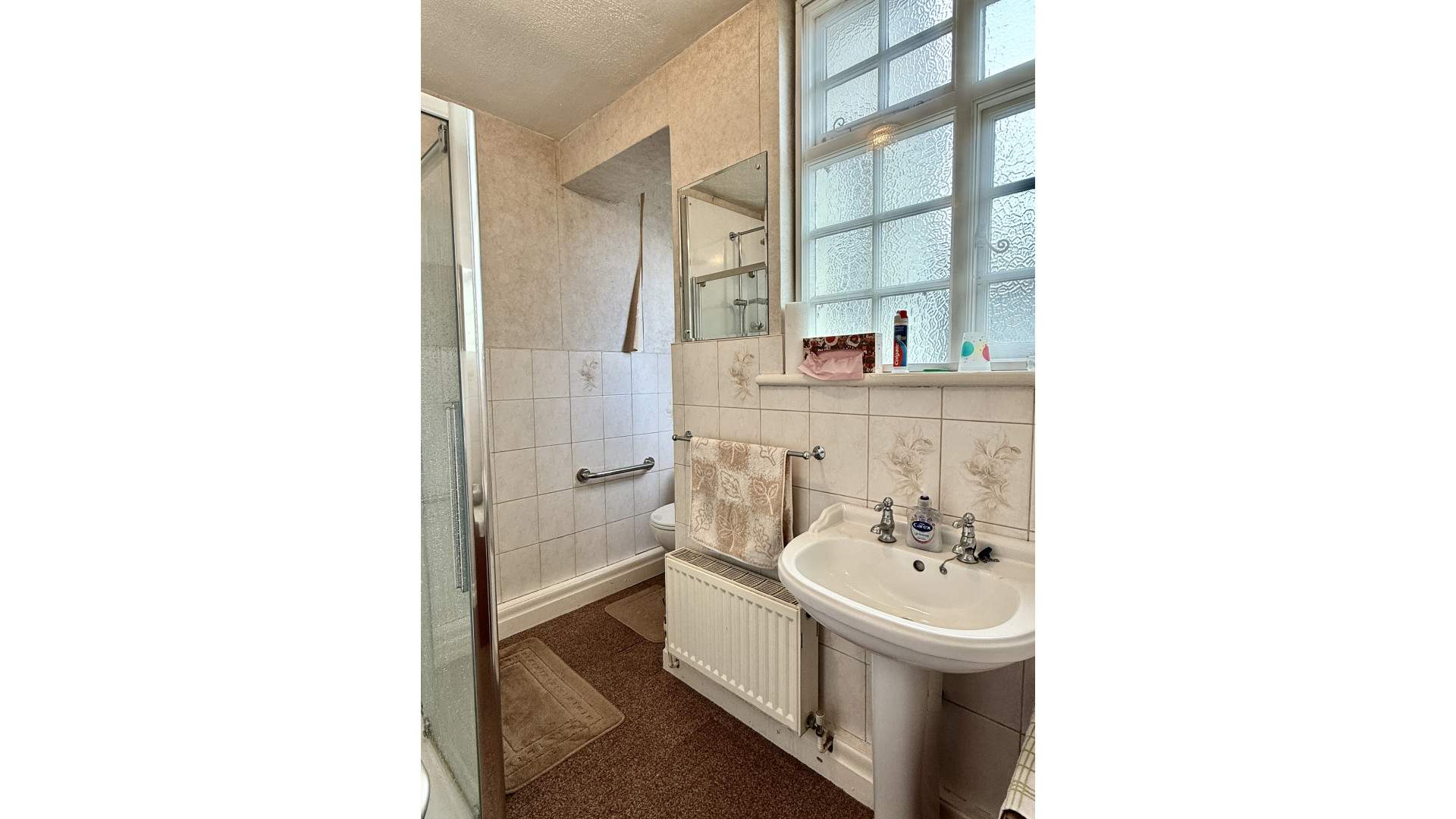 Located on the right when entering the property the bathroom has a white three piece-suite comprising of a rectangular shower enclosure with a sliding glass door. The pedestal sink is beneath the uPVC double glazed window when entering the bathroom, the WC is opposite the shower enclosure with a further window looking on to the front aspect. The bathroom is finished with a ceiling light and carpeted flooring