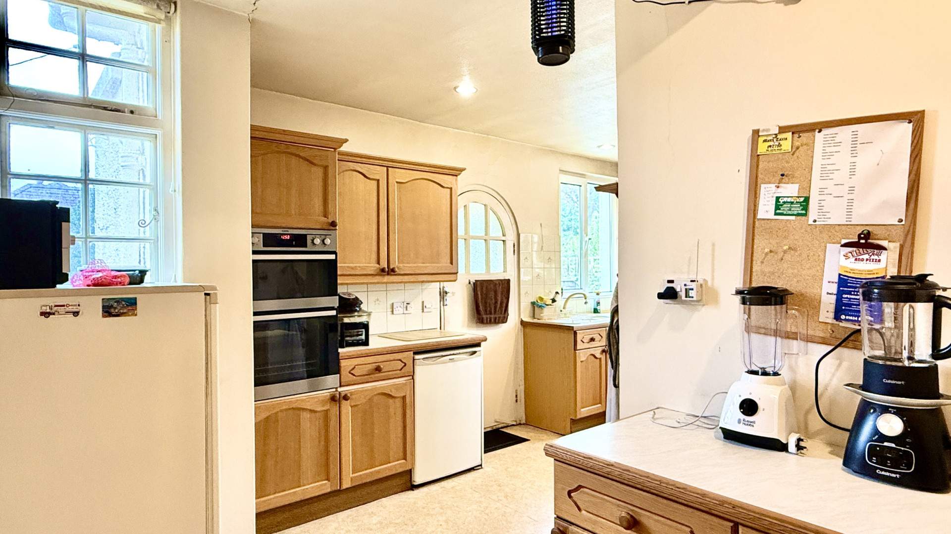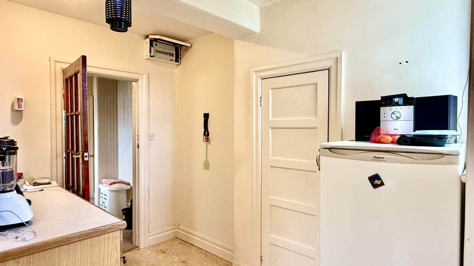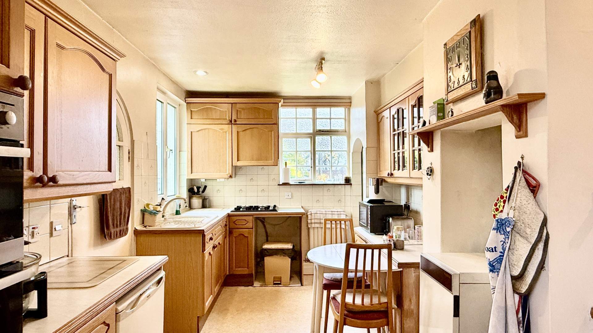 Accessed from the hallway the kitchen has floor and wall mounted to three walls providing ample storage. The electrical mains board for the property is above the door when entering the kitchen from the hallway There is a pantry cupboard on your left and a window looking on to the side aspect To the left of the door accessing the rear porch is the integrated electric oven with grill above and space below the work top for a standalone fridge or freezer. To the right of the door is a uPVC double glazed window providing views on to the side aspect, with the sink and drainer beneath and the gas hob. In the rear porch there is a cupboard for storage and door accessing the side aspect. The kitchen is finished with recessed ceiling spot lights and linoleum flooring throughout.