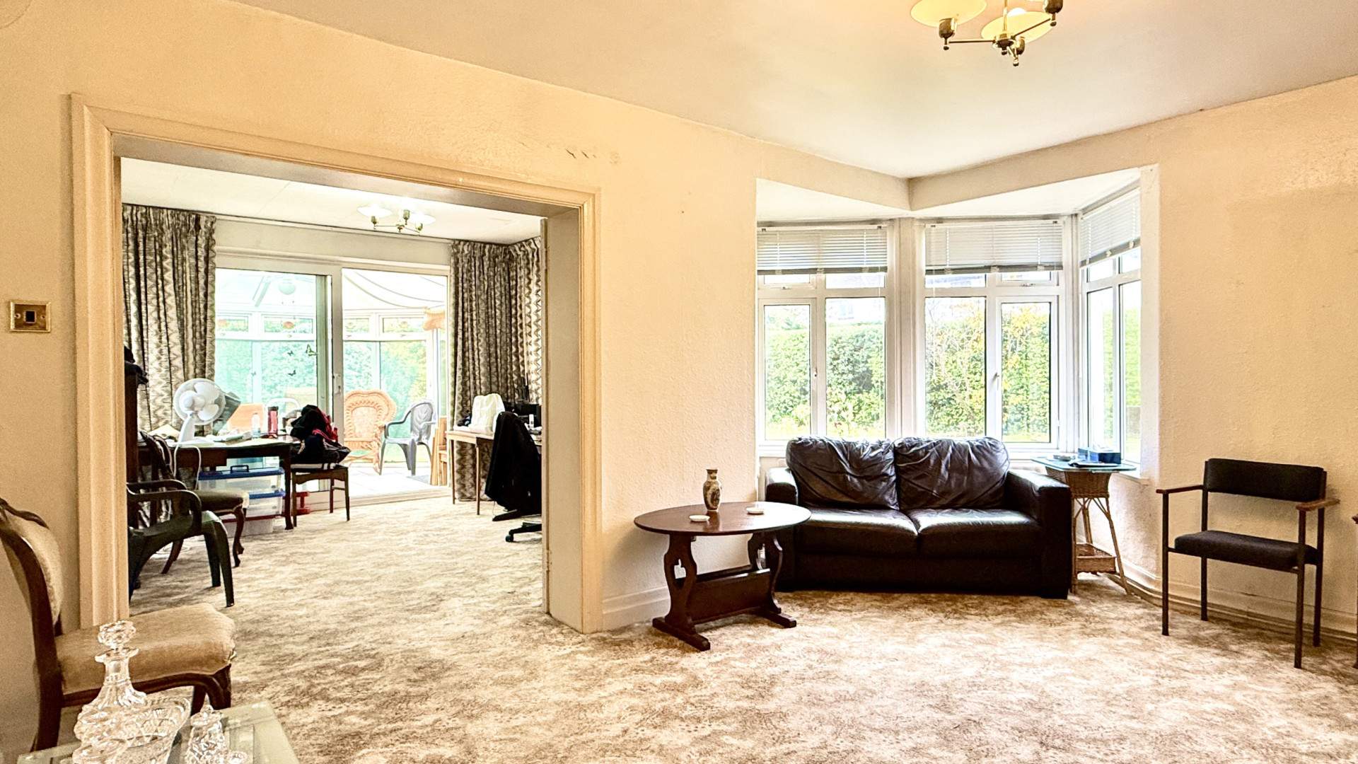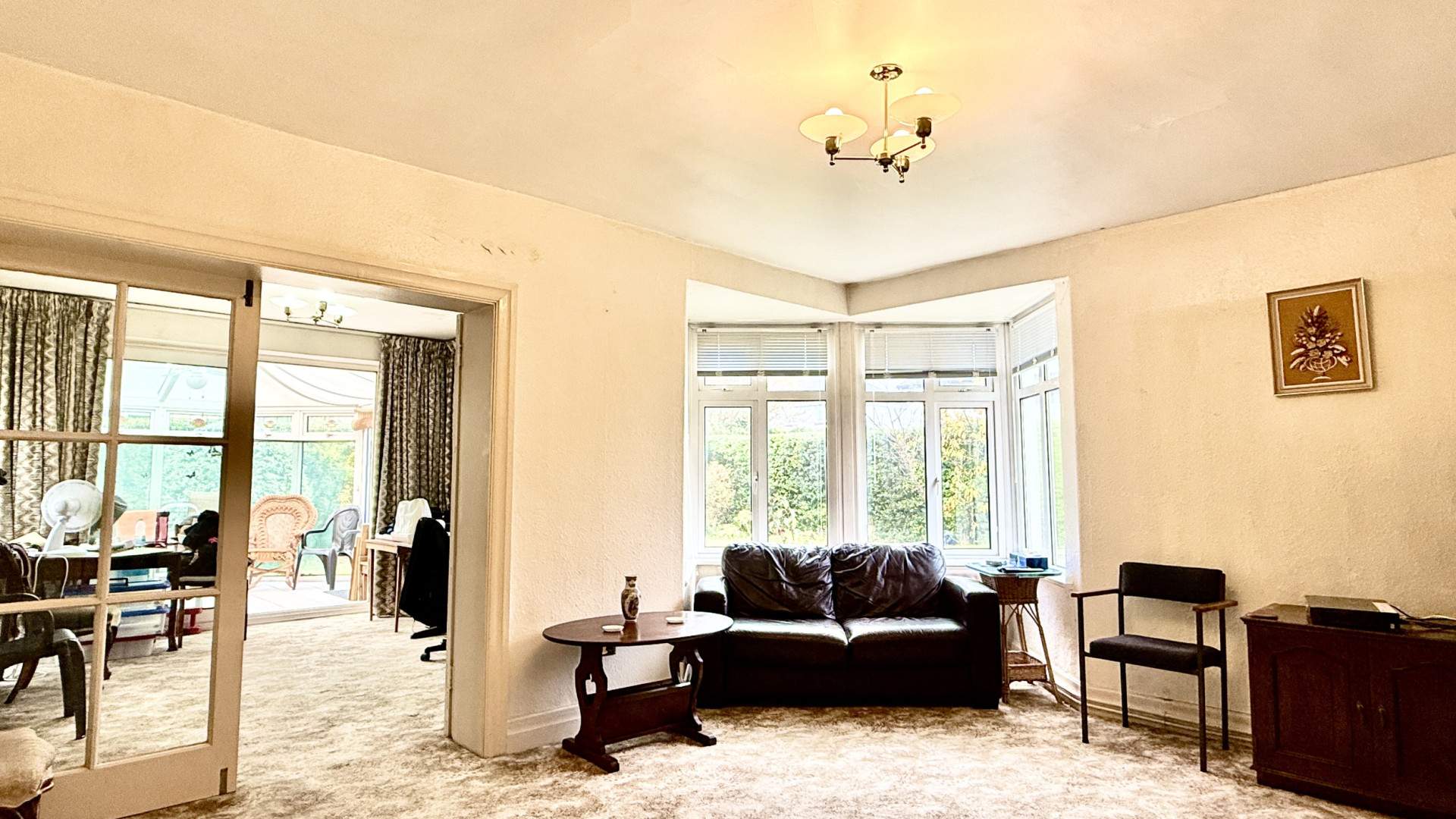 Spacious and bright with a uPVC double glazed large bay window providing views on to the rear aspect of the property. On your right when entering the lounge from the hallway is a fire place with an electric fire, a set of paned wooden doors ahead of you provide access to the sitting room. With the paned double doors this gives an open plan feel which would flow through to the sitting room and conservatory. The lounge is finished with a ceiling light and carpeted flooring.