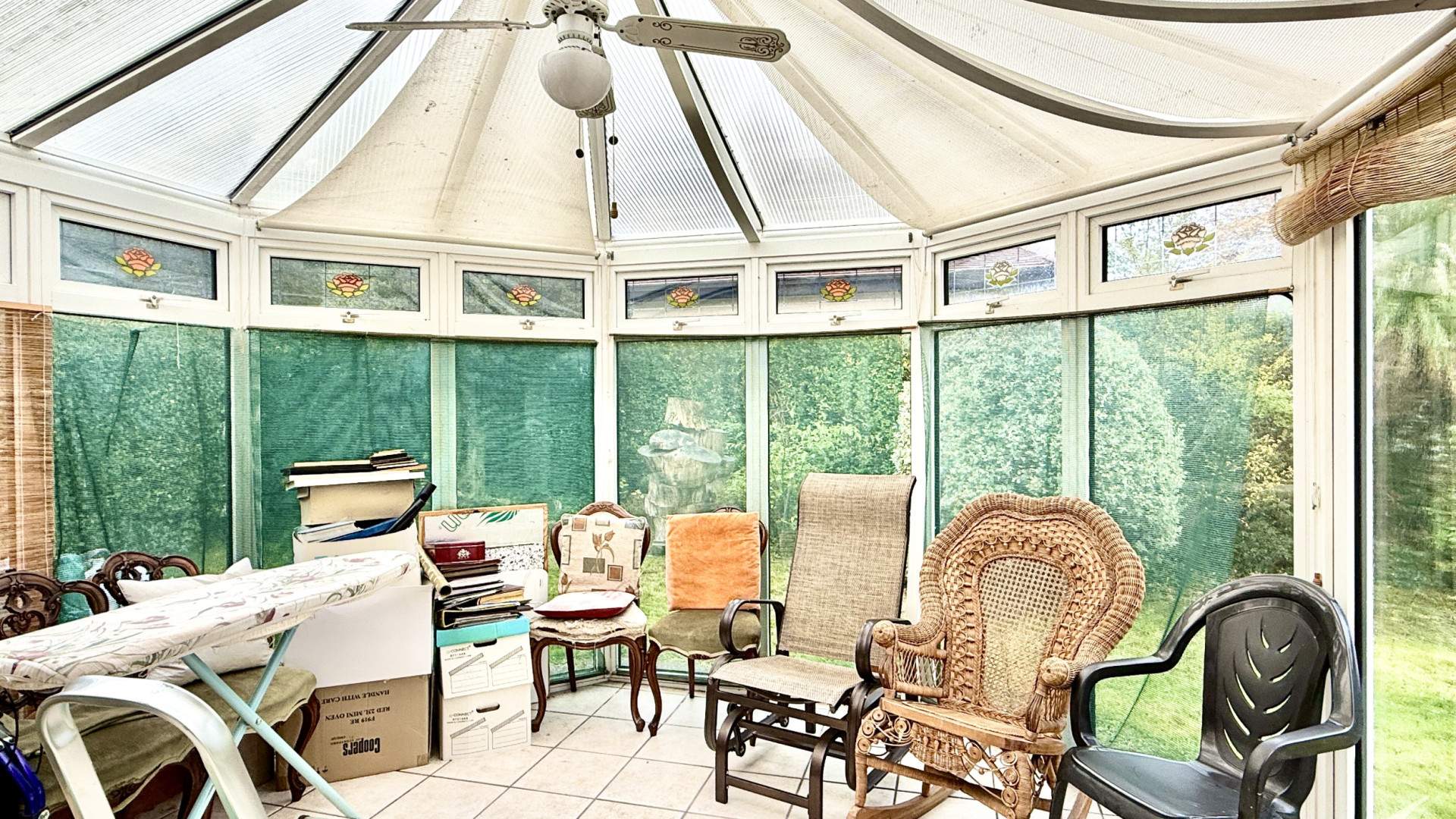 Hexagonal shaped conservatory with uPVC double glazed windows floor to ceiling in height and a set of double doors allowing access to the rear aspect. There is a centre ceiling light with a fan, the conservatory is finished with tiled flooring.