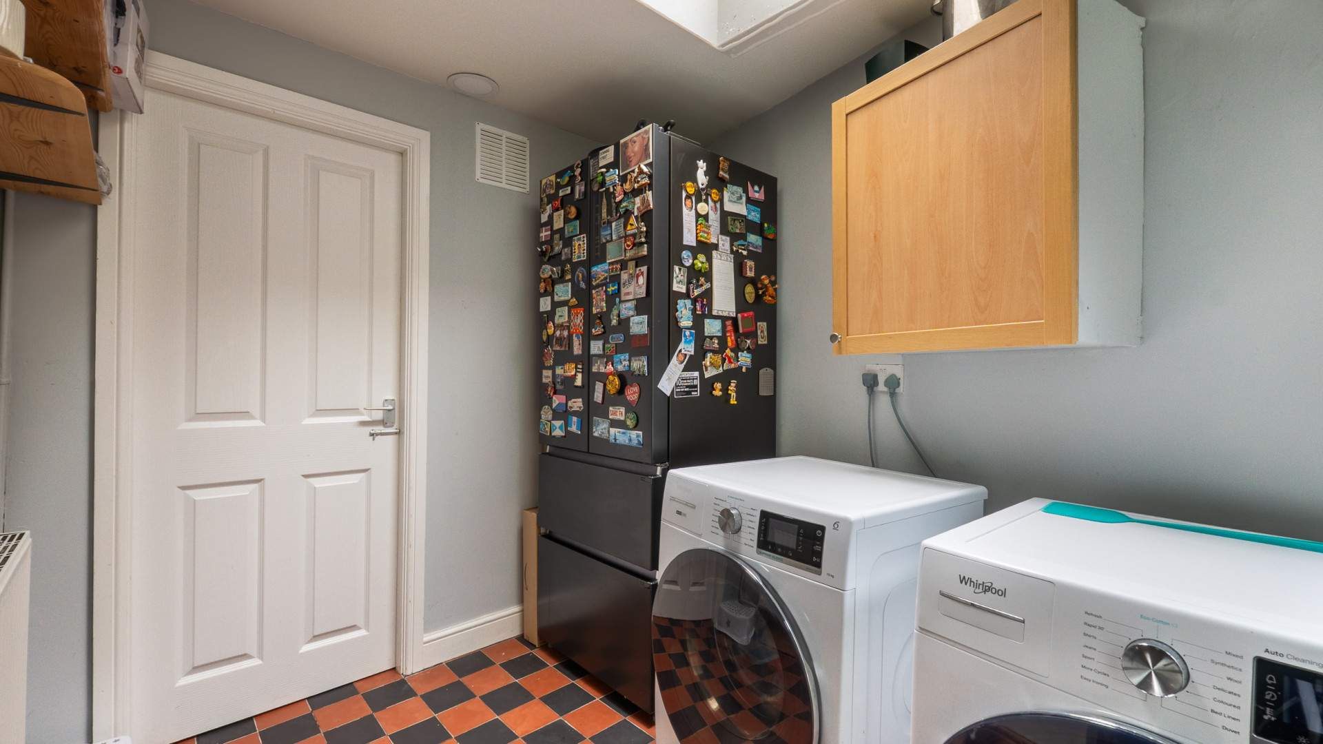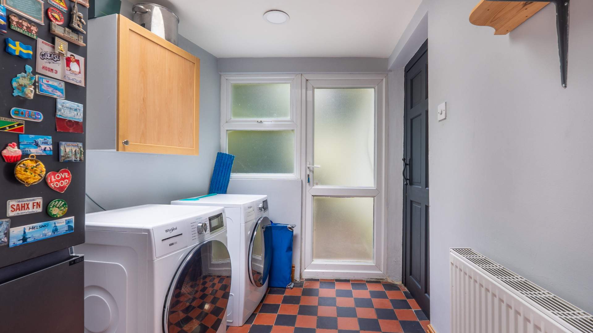 Houses the fridge/freezer, washing machine and dryer. Skylight. Frosted uPVC double glazed window and uPVC door with frosted glazed panels, providing access to the rear of the property. Tiled flooring.