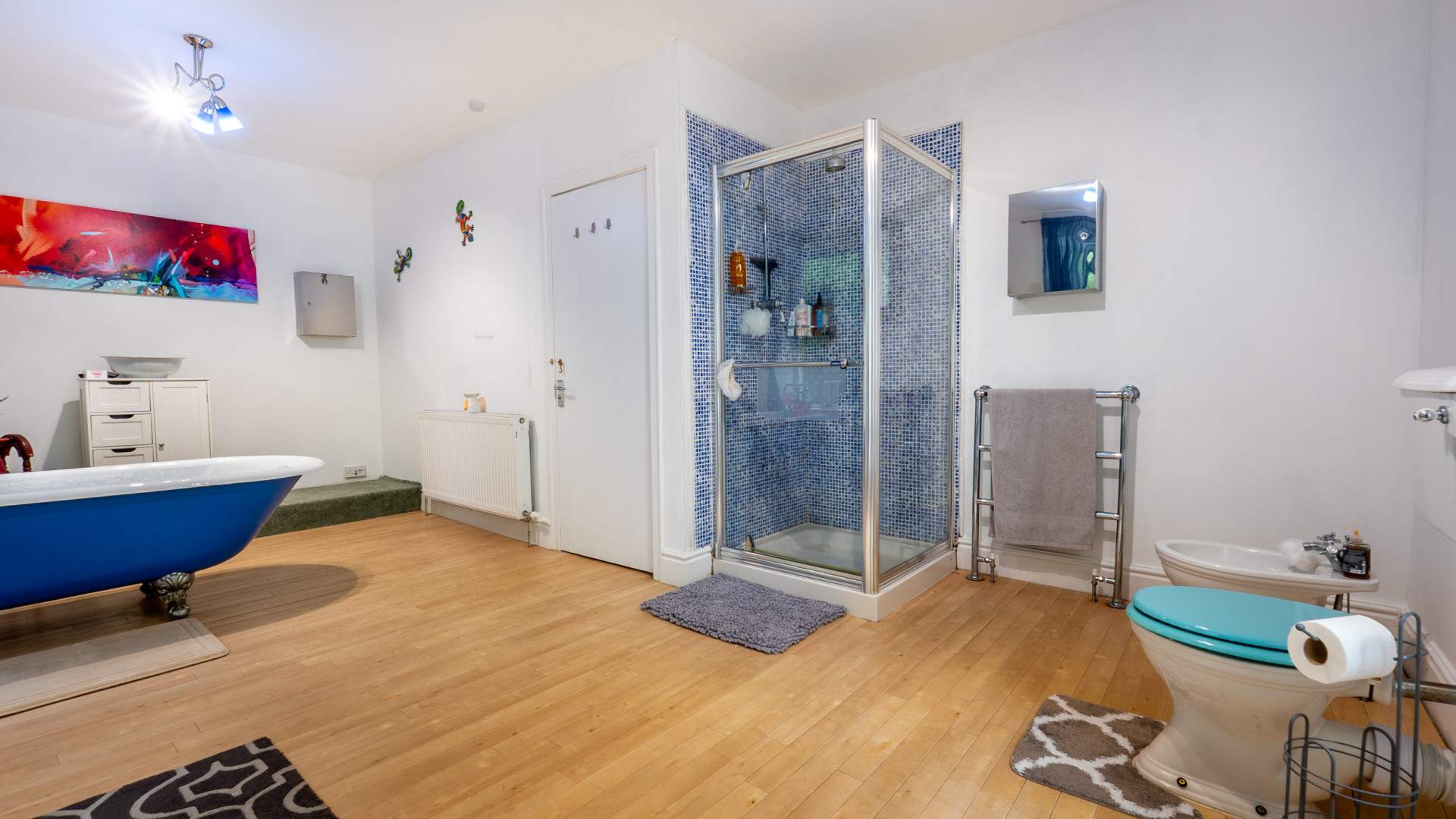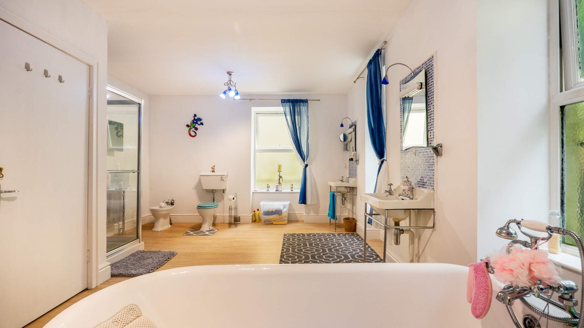 Fitted with a six piece suite comprising of a roll top bath tub, shower cubicle, his and hers wash hand basins, bidet and W.C. Heated towel rail. Two dual aspect frosted uPVC double glazed windows.