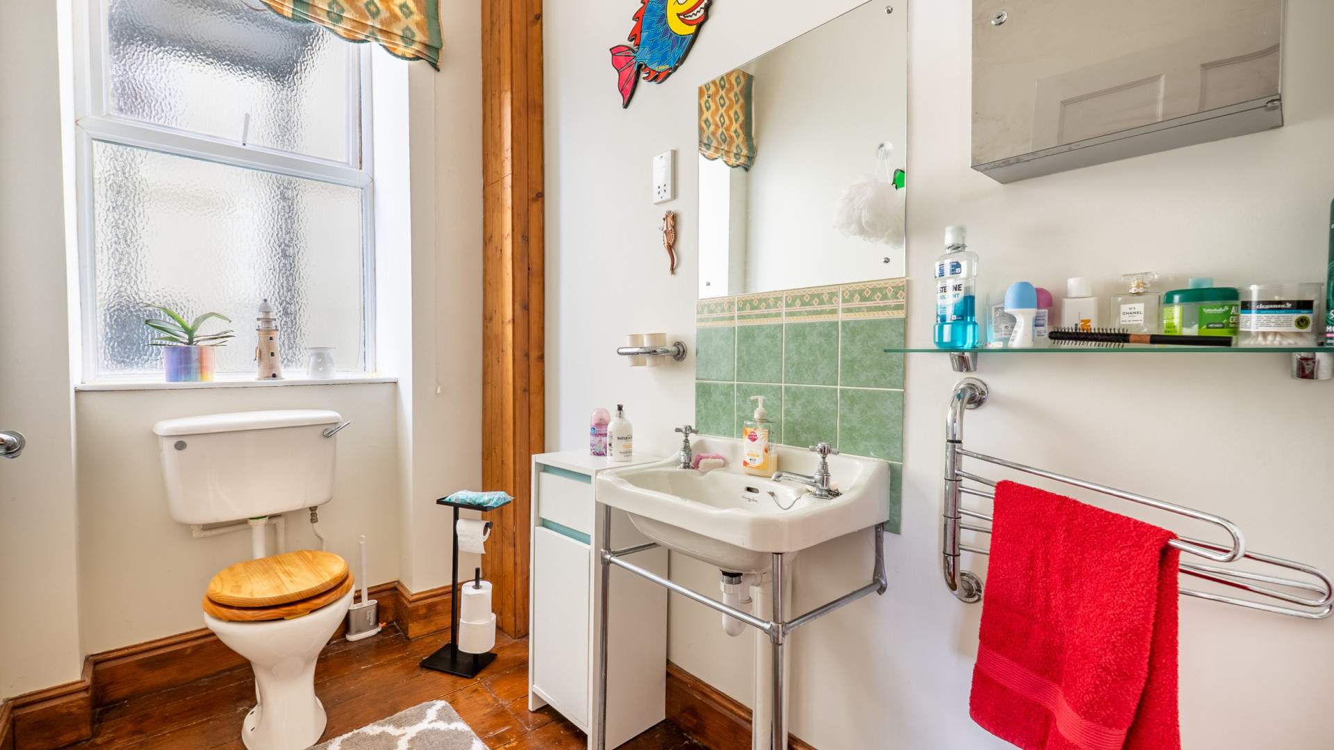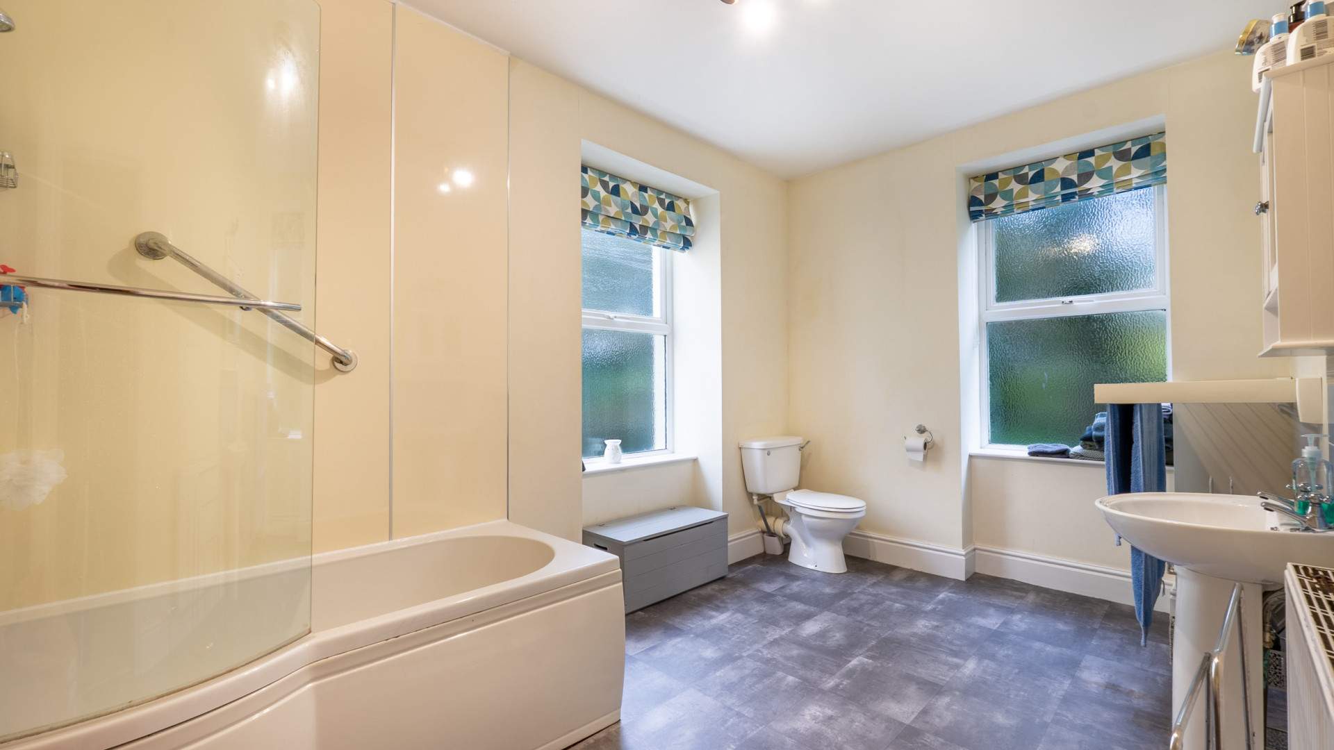 Fitted with a three piece suite comprising of a panel bath with a shower attachment over and splash screen, pedestal wash hand basin and W.C. Two dual aspect frosted uPVC double glazed windows. Radiator.