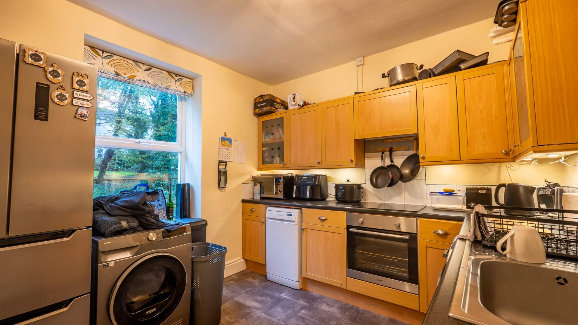 Fitted with a range of wooden fronted base, wall and drawer units. Work surfaces incorporate a large stainless steel single bowl sink with a mixer tap over and drainer. Appliances included in the sale comprise of: an integrated Cooke & Lewis four ring halogen hob with an extractor hood above, integrated Logik electric oven/grill, slot-in Hotpoint dishwasher, Samsung washing machine, tumble dryer and a Kenwood fridge/freezer. uPVC double glazed window overlooking the rear.