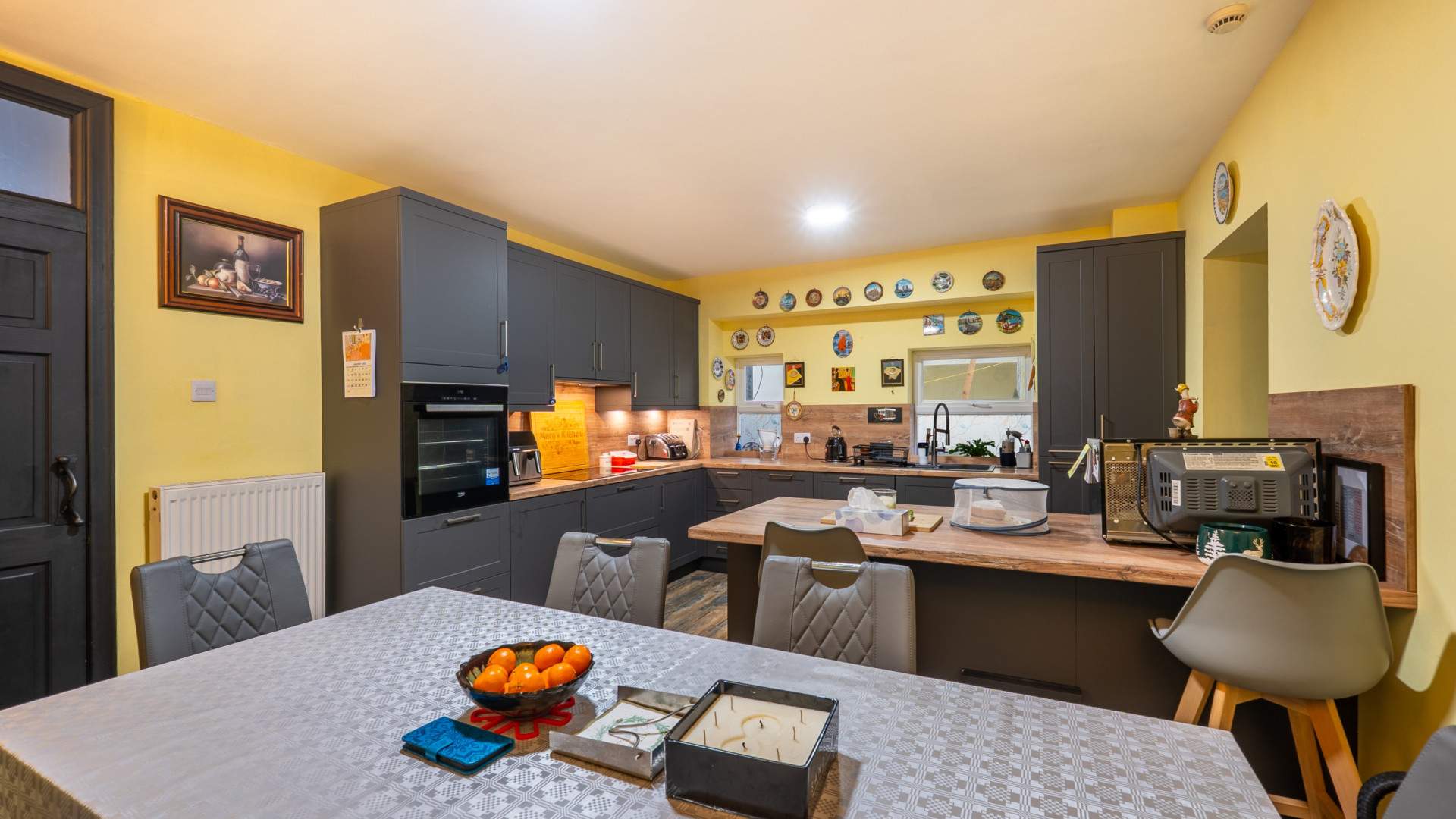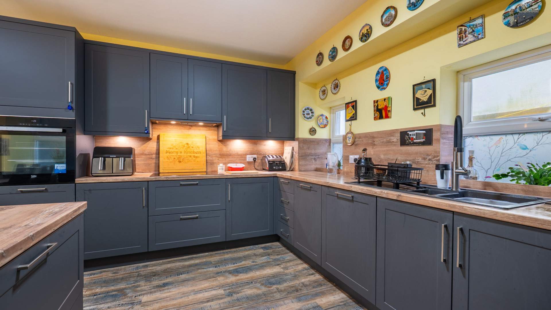 Fitted in 2024 with a range of base, wall and drawer units. Wooden work surfaces incorporate a one and a half bowl sink with a mixer tap over and drainer. Central island breakfast bar. Cupboard housing a concealed bin. Integrated Beko oven with the remainder of a 2 year warranty, AEG five ring electric induction hob and an integrated AEG dishwasher. Three dual aspect uPVC double glazed windows. Ample space for a six seater dining table. Door into: