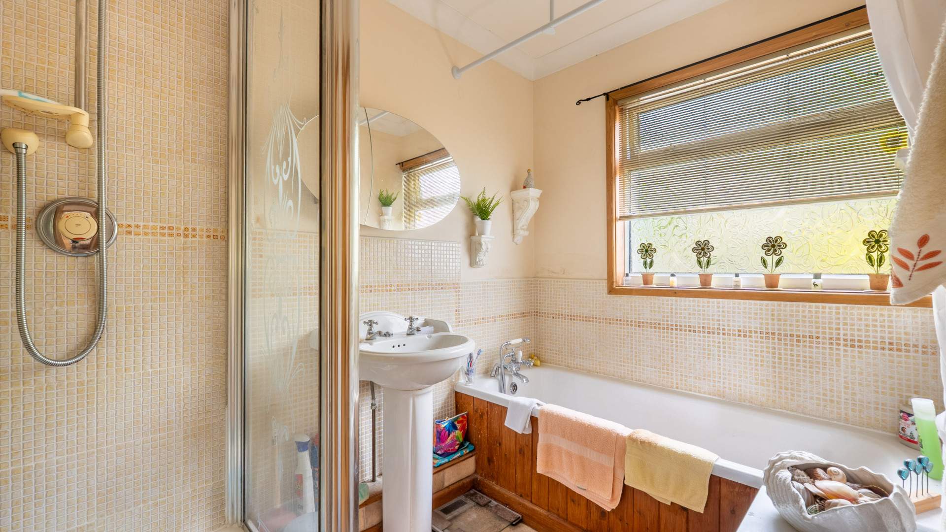 - Family Bathroom (approx. 8’0 x 5’8): Fitted with a three piece suite comprising of a bath tub with shower attachment, walk-in shower cubicle, pedestal wash hand basin. Frosted uPVC double glazed window. Heated towel rail. Extractor fan. Ceiling downlighters.