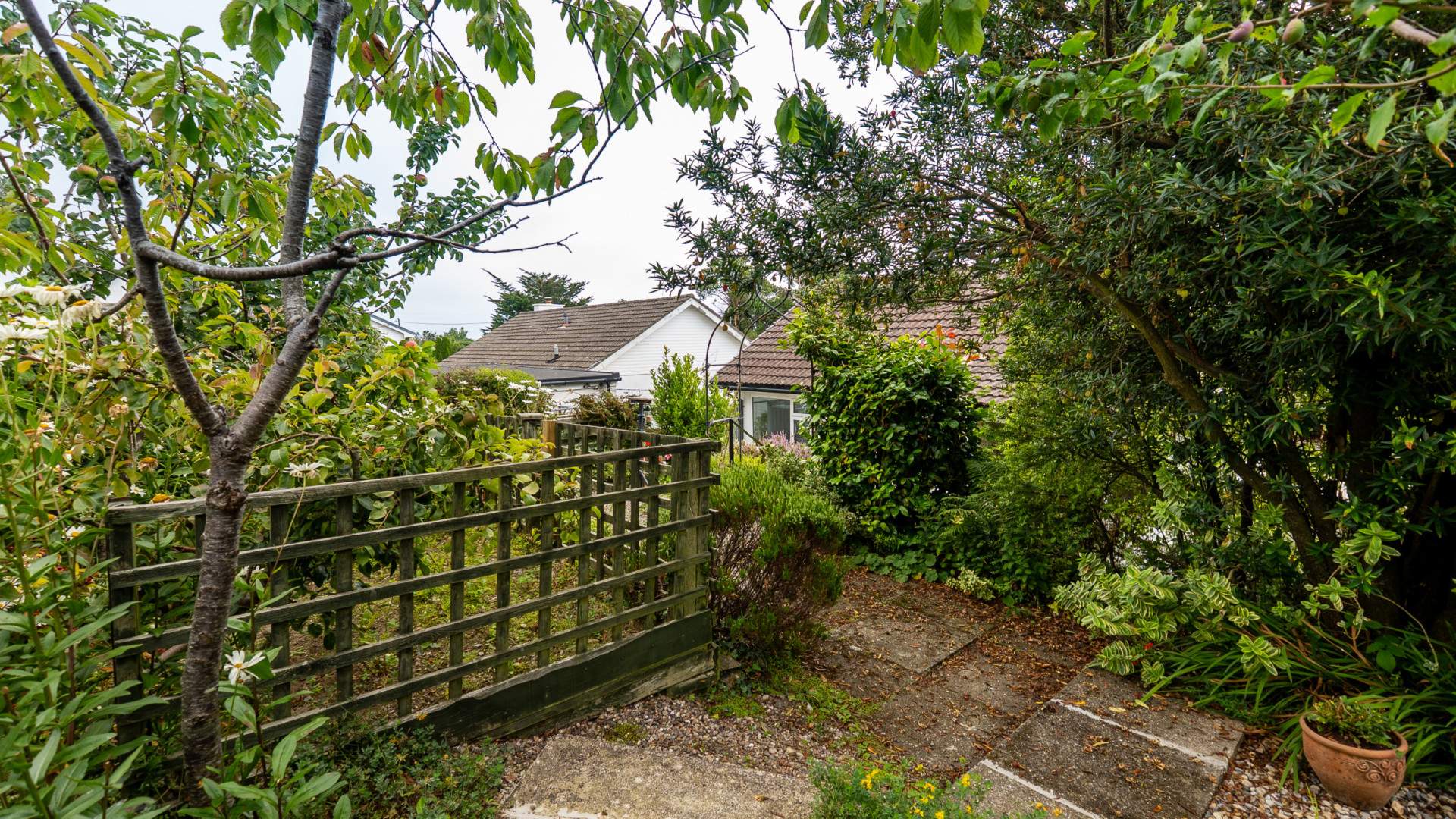 To the front of the property there is a lawned garden with multiple mature shrubs and a footpath leading to the front door which provides access round to the side and rear garden. Driveway providing off road parking for at least two vehicles and providing access to the garage.
