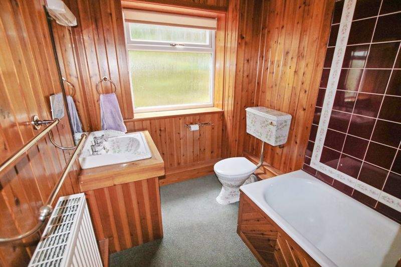 Suite comprising panelled bath, enclosed shower cubicle, w.c., wash hand basin with mirror and light above, tiled splashbacks. Pine walls and ceiling.