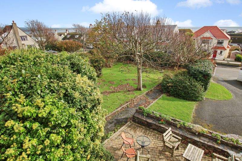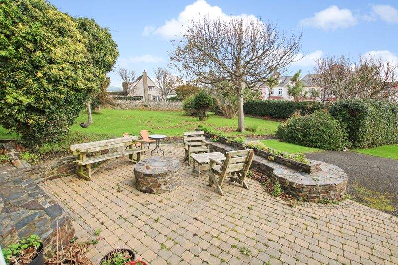 Large double plot with walled private front and side gardens mainly laid to lawn with mature shrubs and trees, block paved patio seating area. Private rear garden. Well maintained front driveway and turning area.