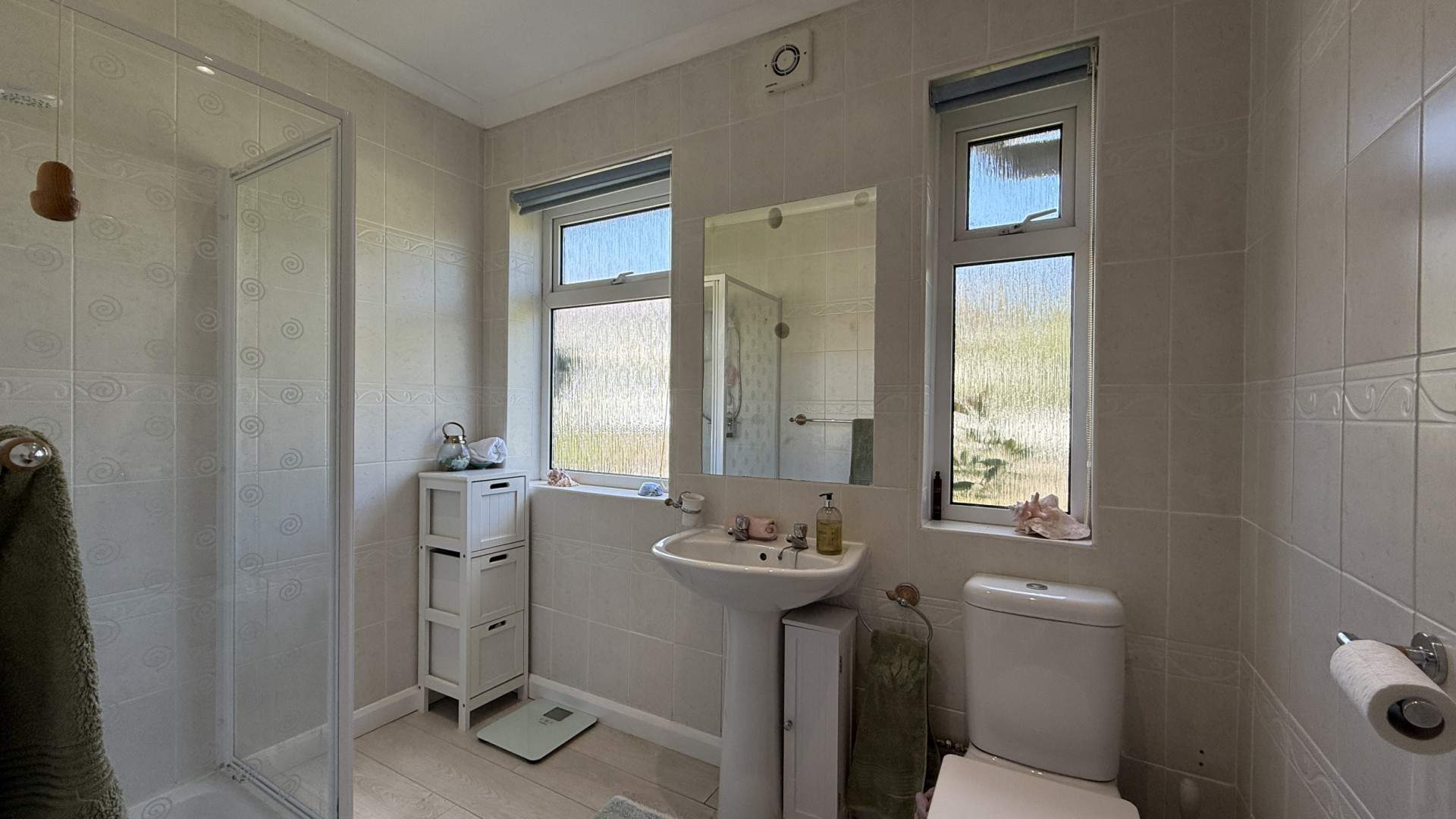Bright airy bathroom with two uPVC double glazed frosted windows looking on to the front aspect. A square white shower cubicle is on your left with a Triton electric shower. The white pedestal sink is located between the two windows with a recessed wall mirror above. The WC is under the right-hand window, the bathroom is finished with an extractor fan, recessed ceiling lights and vinyl flooring.