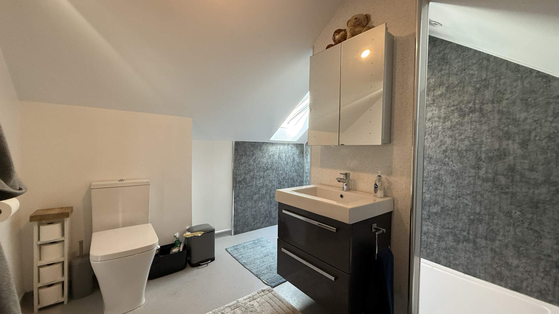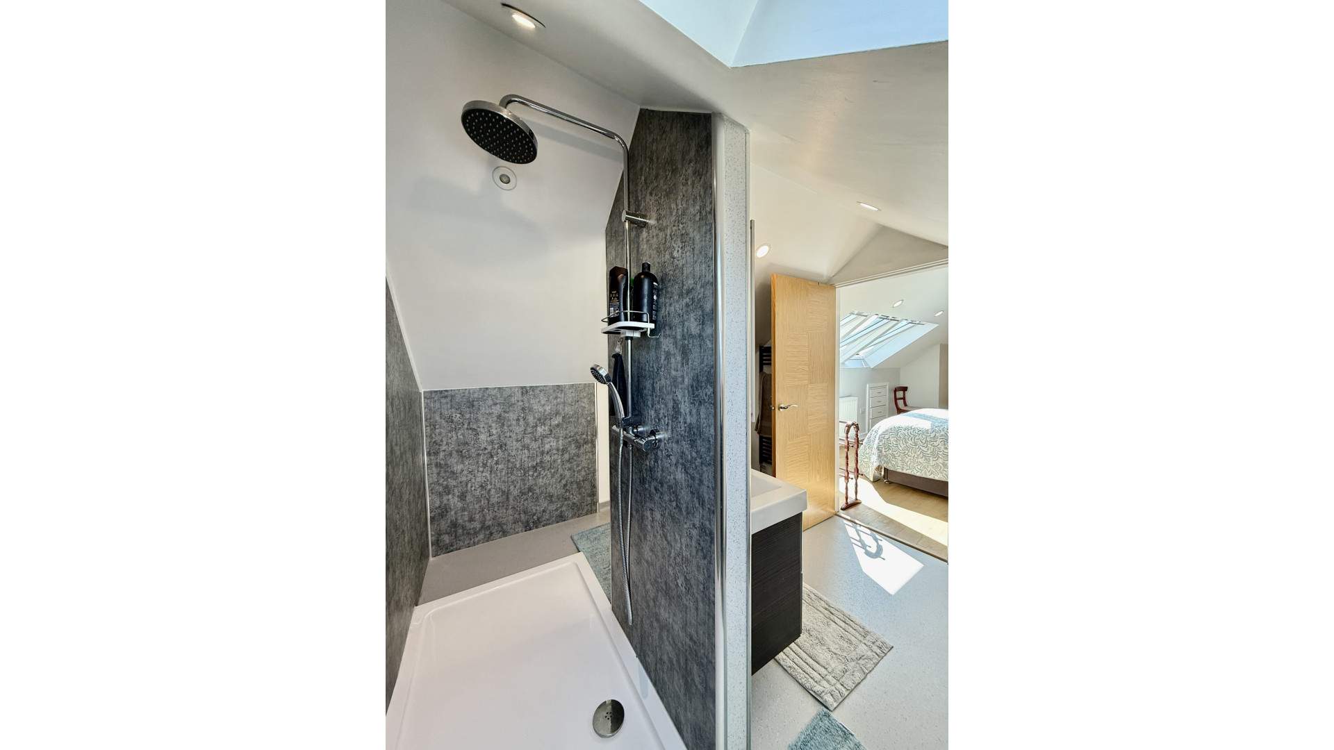 Wonderfully designed, spacious bathroom with an open shower design which is accessed from either side of the wall where the wall mounted sink is located. The shower area is finished with mermaid board from floor to ceiling. Above the sink is a wall mounted double cupboard with mirrored doors for storage. The white WC is on your left when entering the bathroom with a Velux window to the front aspect and an extractor fan in the shower area. The bathroom is finished with recessed ceiling lights and Marmoleum flooring.