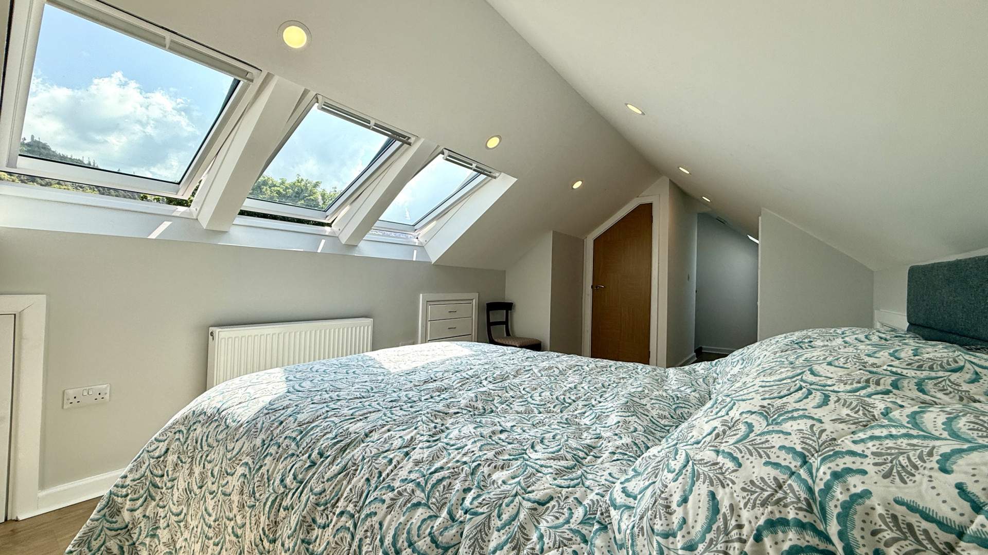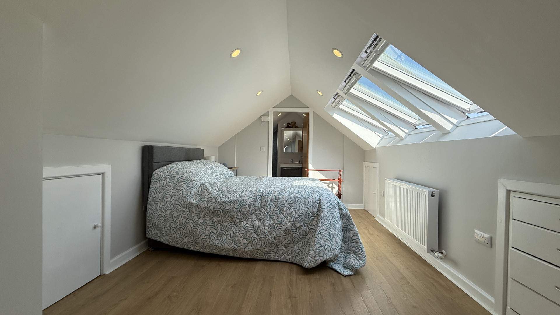 Fantastic third bedroom accessed from the inner hallway with three Velux windows providing views to the Albert tower. When you are at the top of the stairs there is a further Velux window which looks on to the front aspect. There is ample storage with a large cupboard, two further double cupboards, built in four drawers and access to the eaves. At the far end of the bedroom is a door accessing the en-suite bathroom. The bedroom is finished with recessed ceiling lights and wooden flooring.