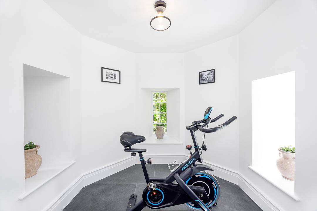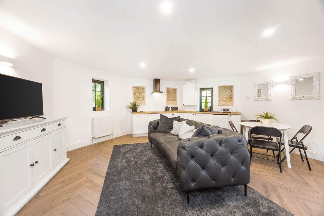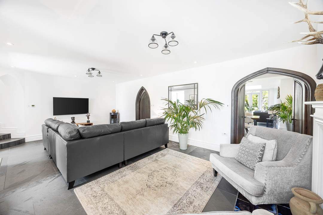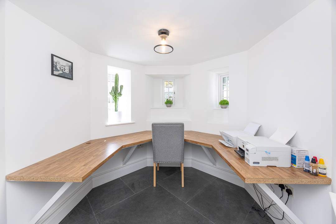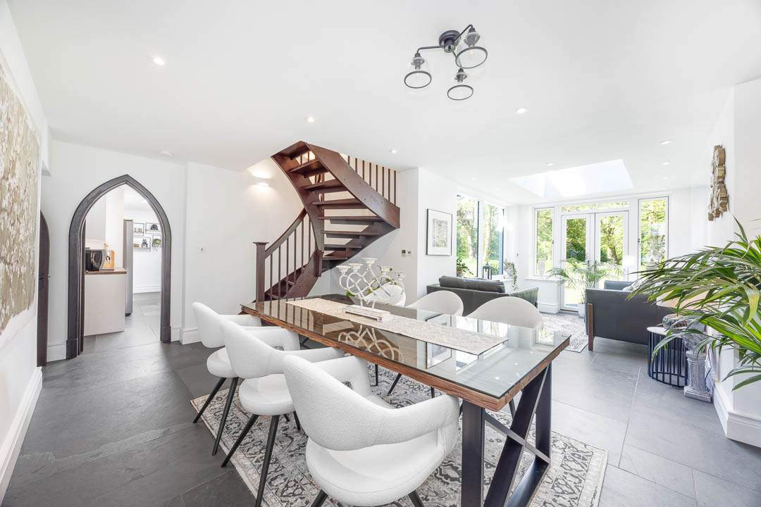 The principal dwelling is a double fronted former Castle. Entering the property through the entrance vestibule which leads into a dual aspect full width cosy living space with underfloor heating and open fireplace. Off the living space, there are openings into the two turrets, one houses a home office and the other is currently used as an exercise space. From the living room there is a door through to the open plan dining space and sunroom, which looks across the property’s gardens. From the dining space there is a bespoke staircase giving access up onto the first floor, there is also access through to a modern fitted kitchen with a range of contemporary style wall and base units. Also on the ground floor there is a potential fifth bedroom, currently used by the vendors as a craft space, this room benefits from a large walk-in wet room style en-suite which has Jack and Jill access through to the utility room as well.